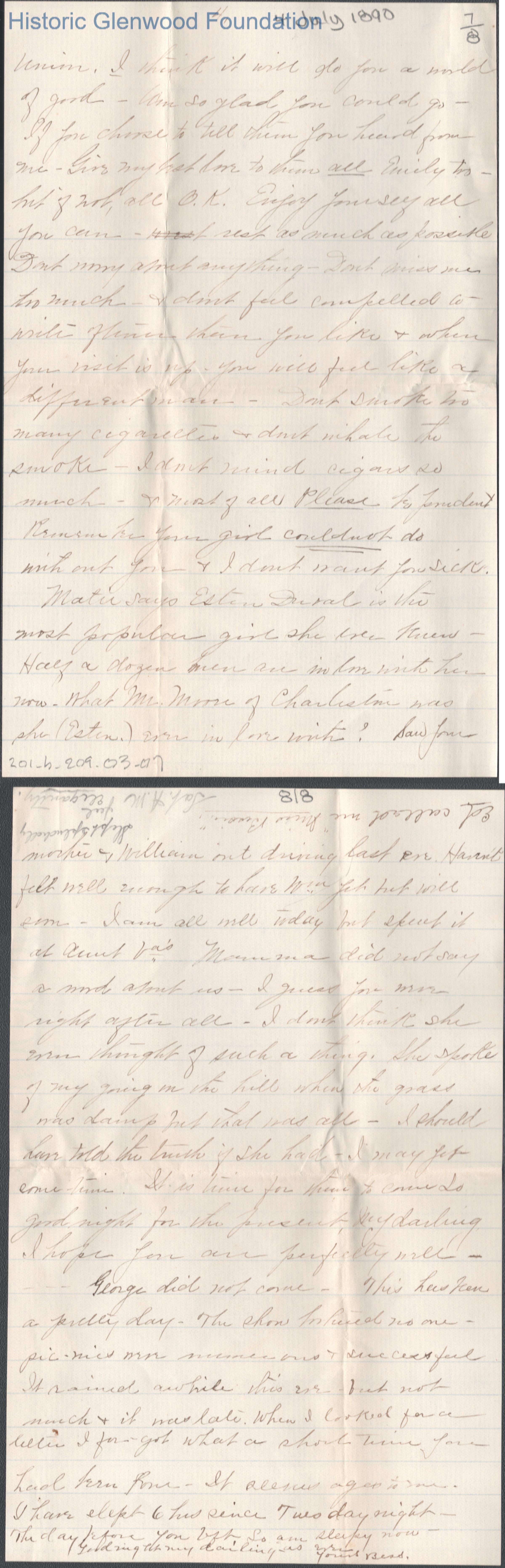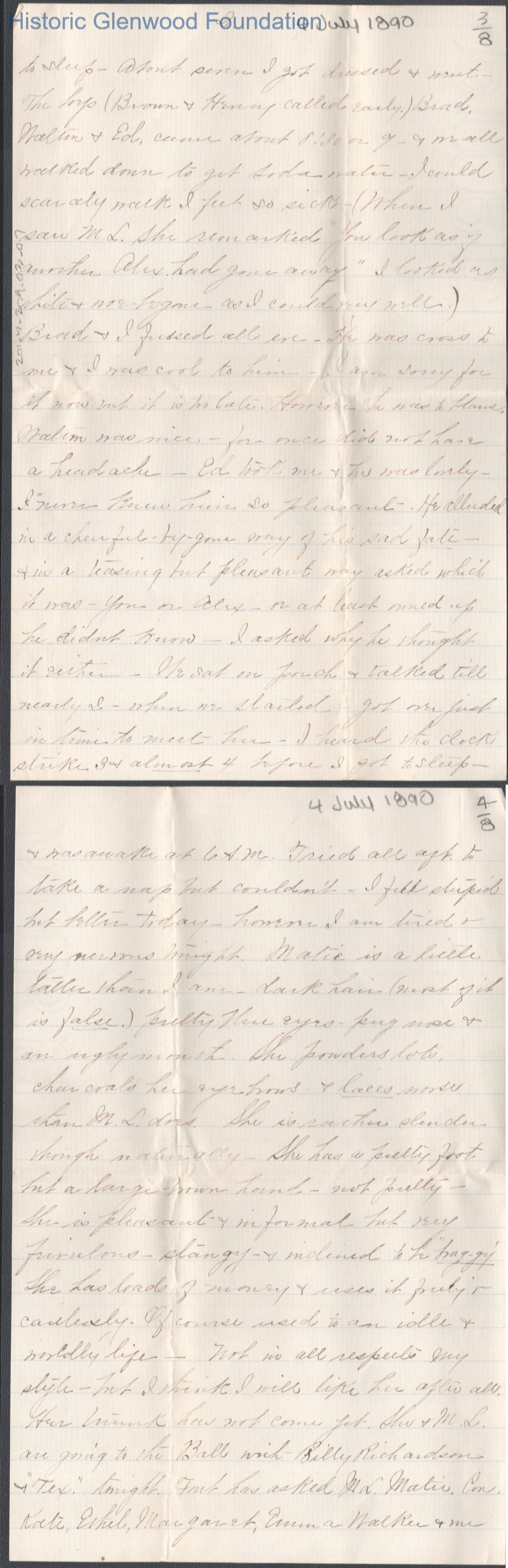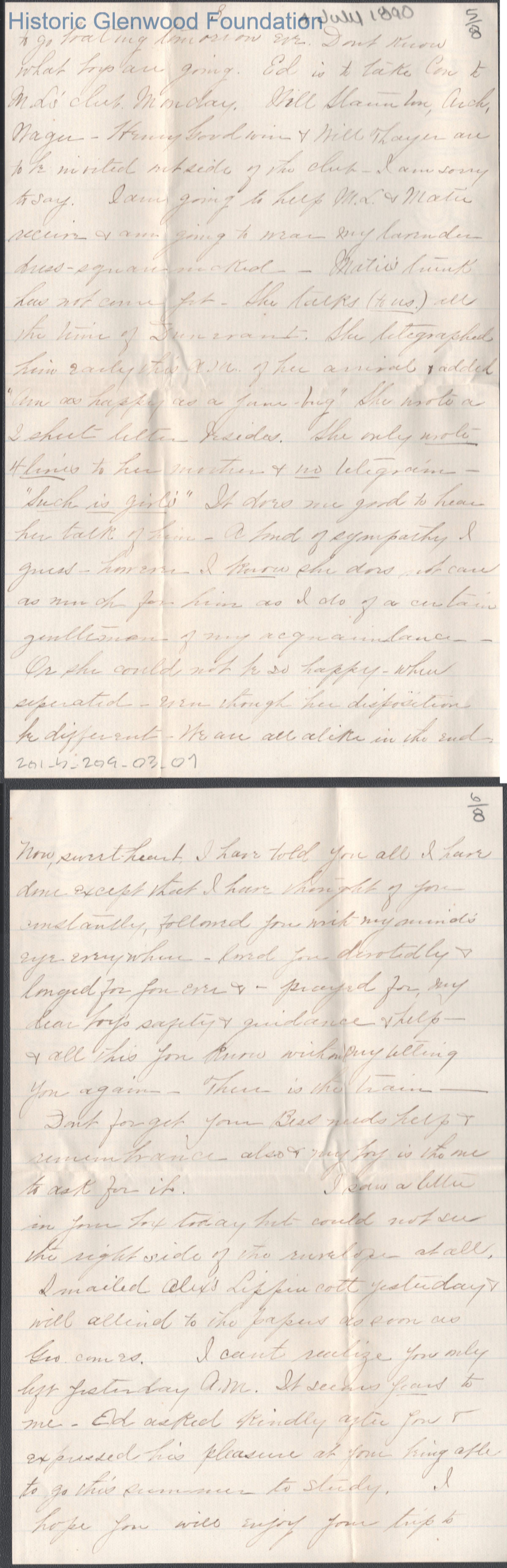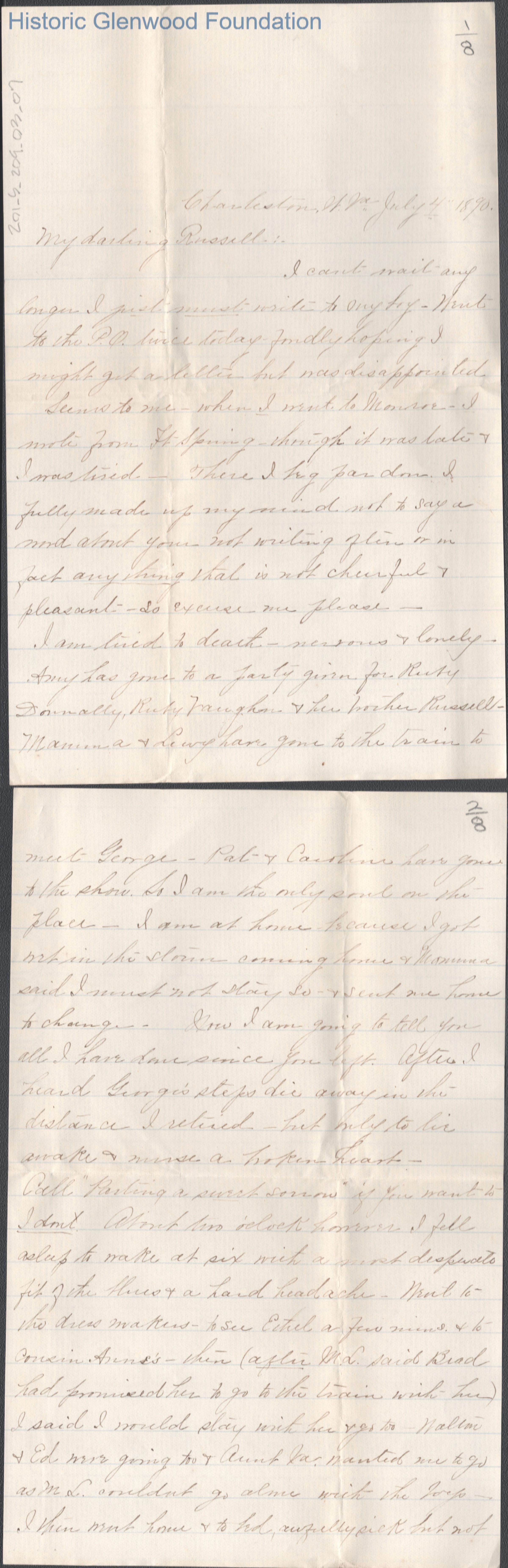 Eight-page letter to Russell G. Quarrier from Elizabeth S. Quarrier, Jul 4, 1890.
