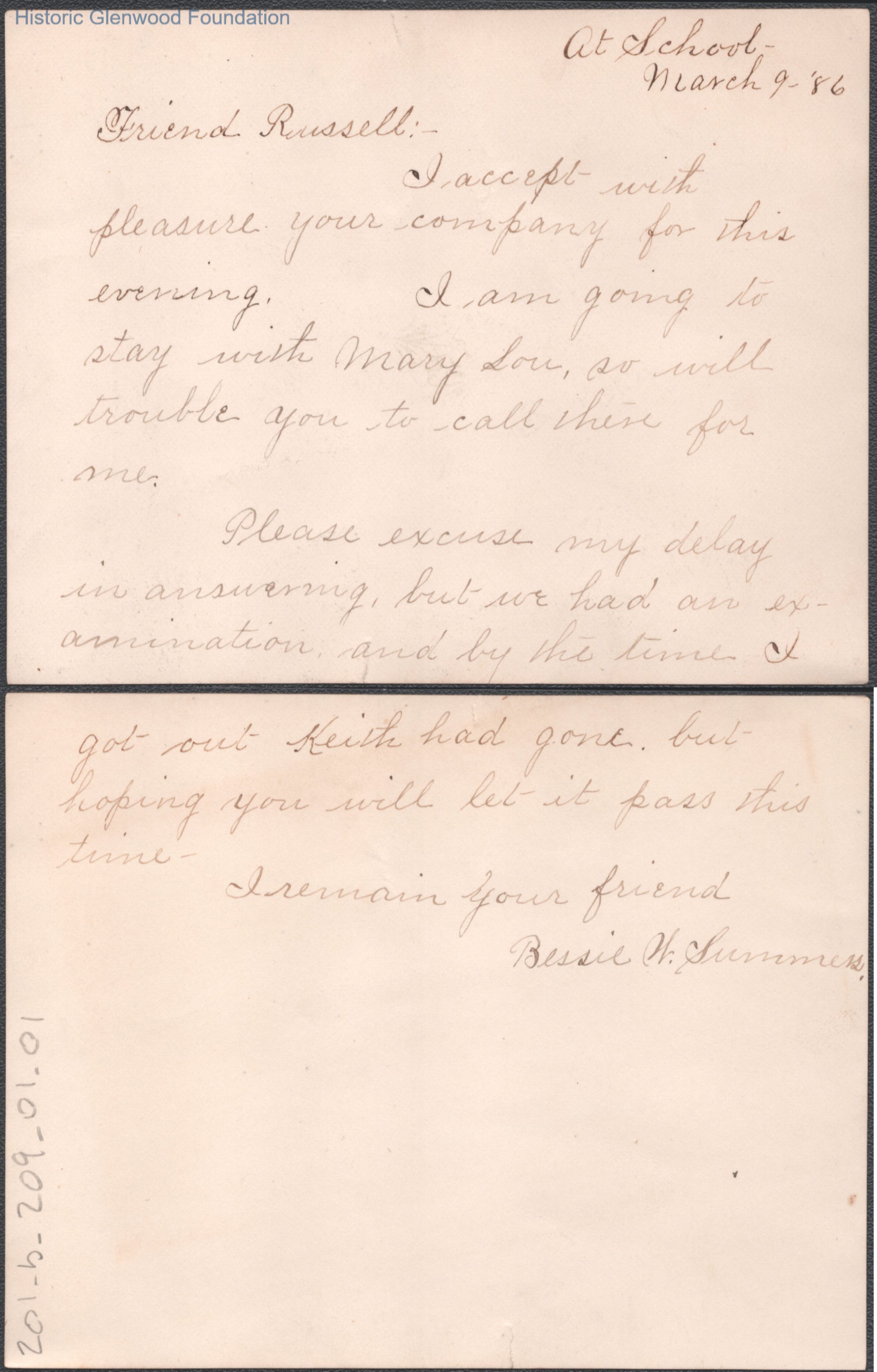 Two-page note to Russell G. Quarrier from Elizabeth S. Quarrier, Mar 9, 1886.
