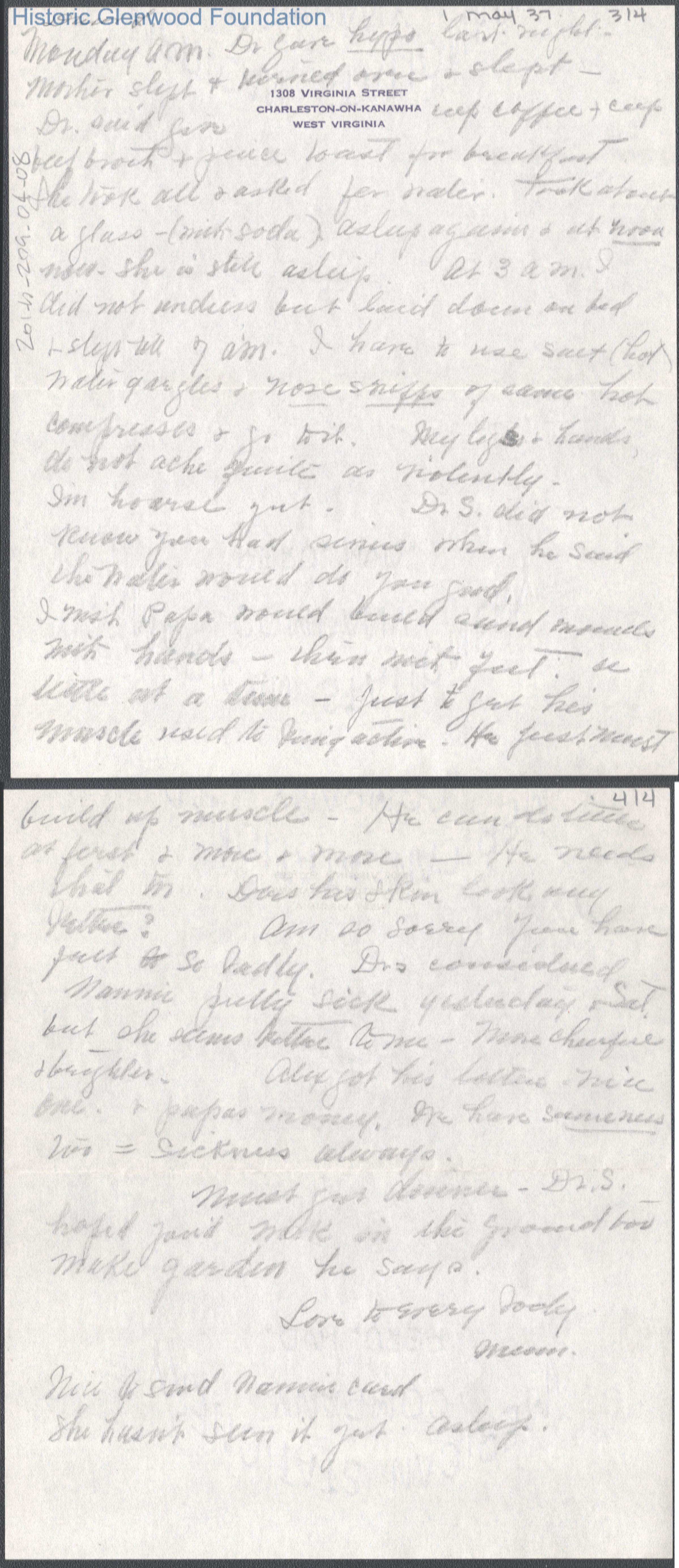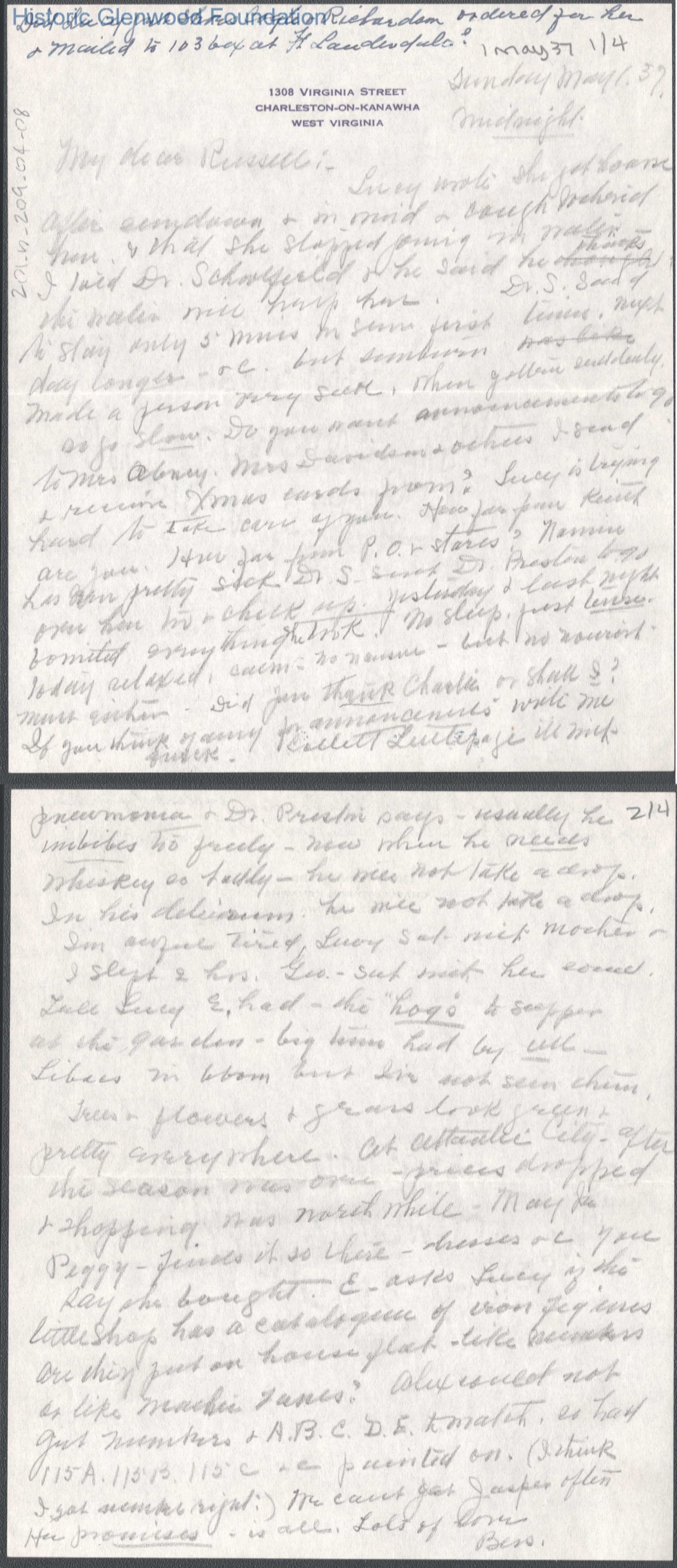 Four-page letter to Russell G. Quarrier from Elizabeth S. Quarrier, May 1, 1937.