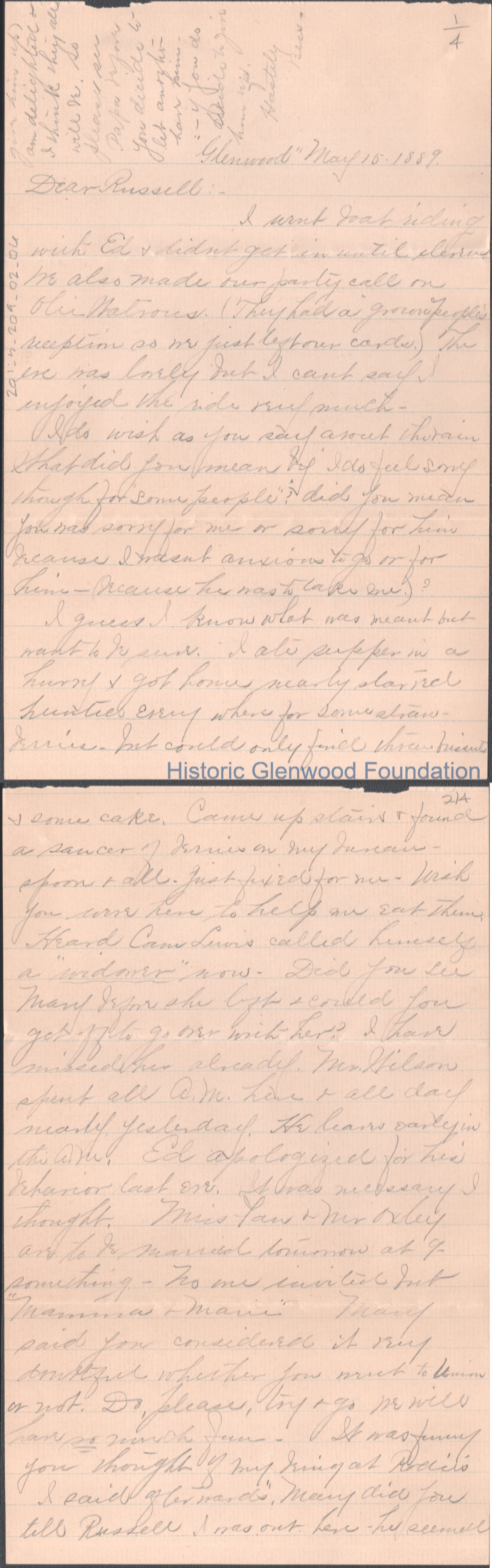 Four-page letter to Russell G. Quarrier from Elizabeth S. Quarrier, May 15, 1889.