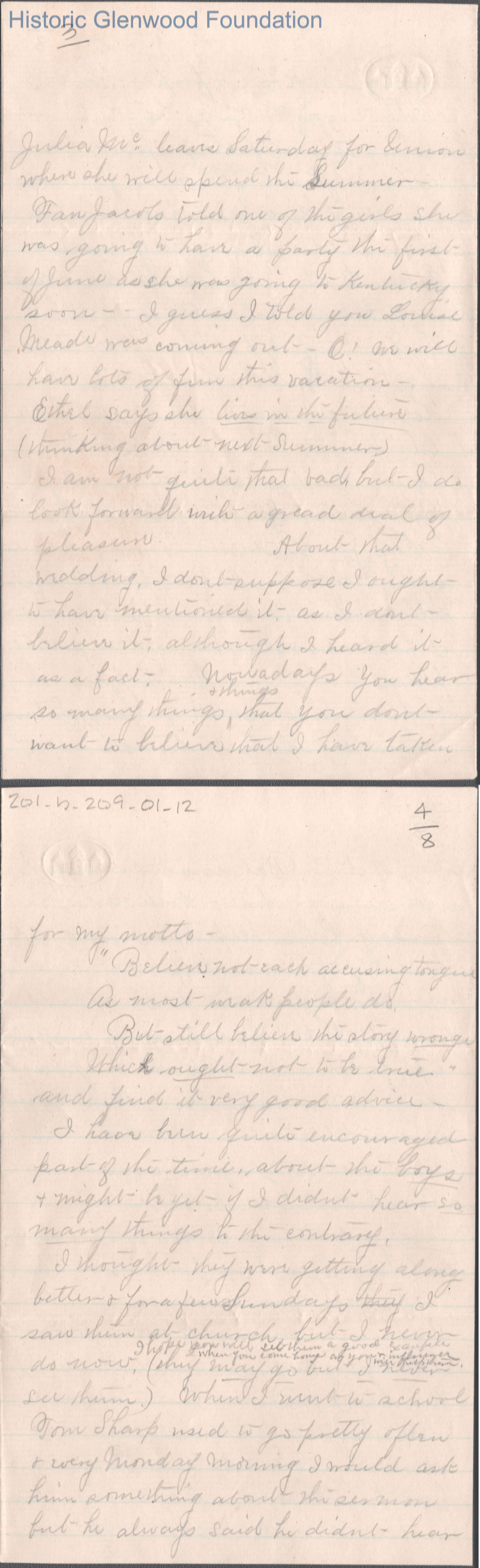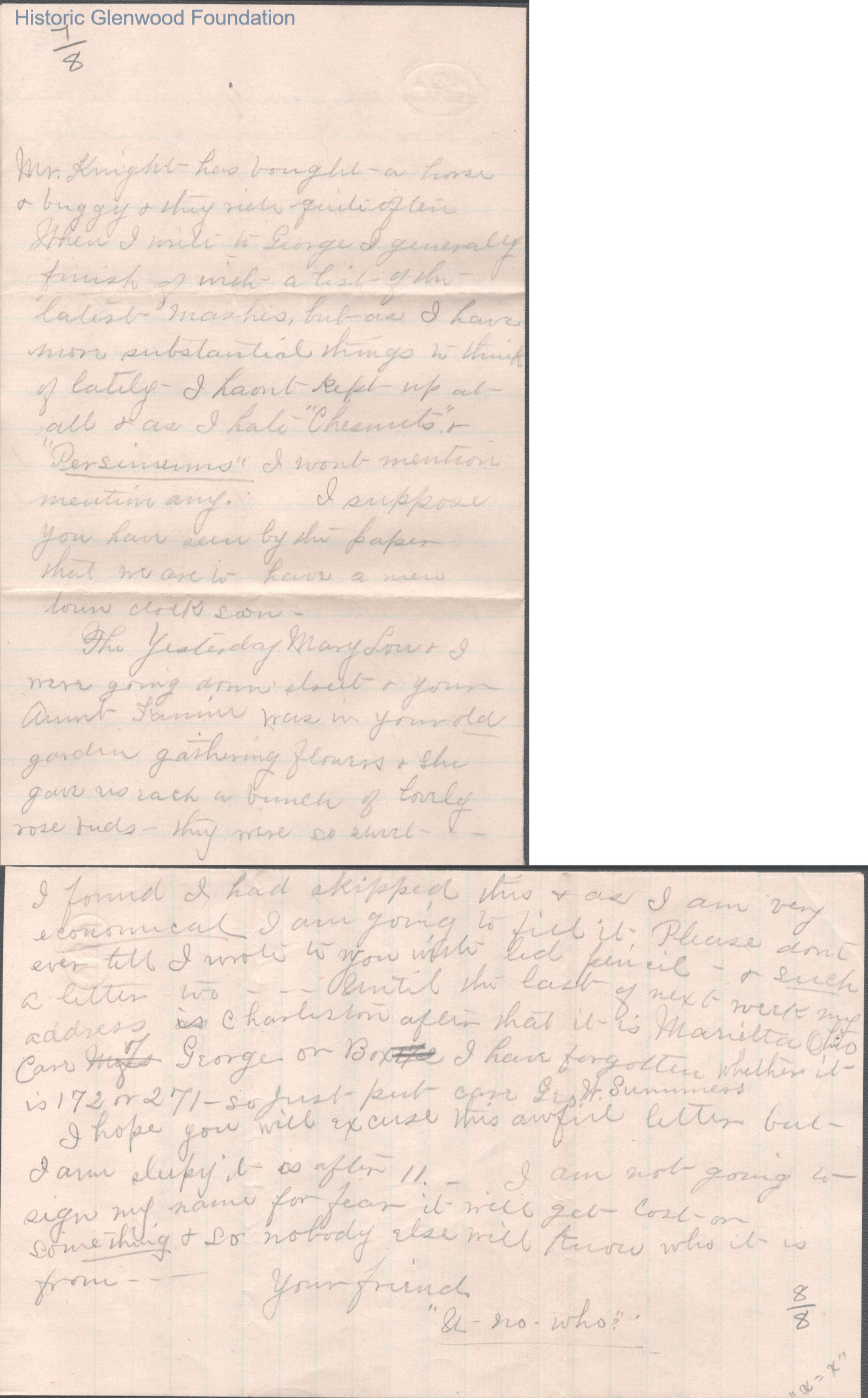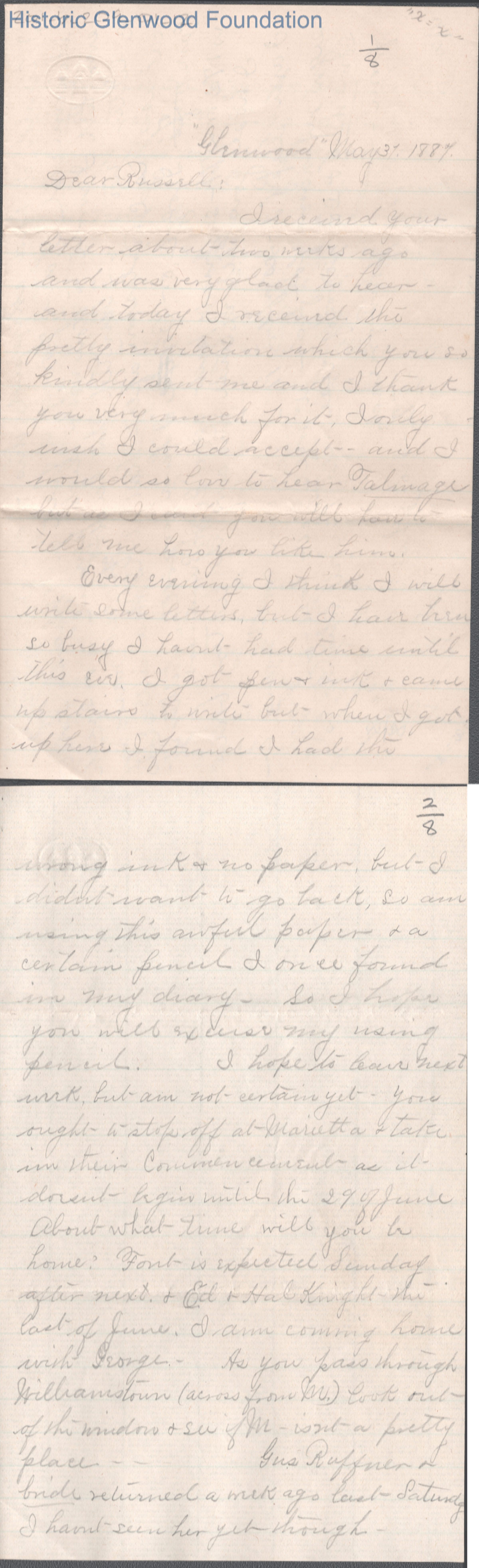 Eight-page letter to Russell G. Quarrier from Elizabeth S. Quarrier, May 31, 1887.