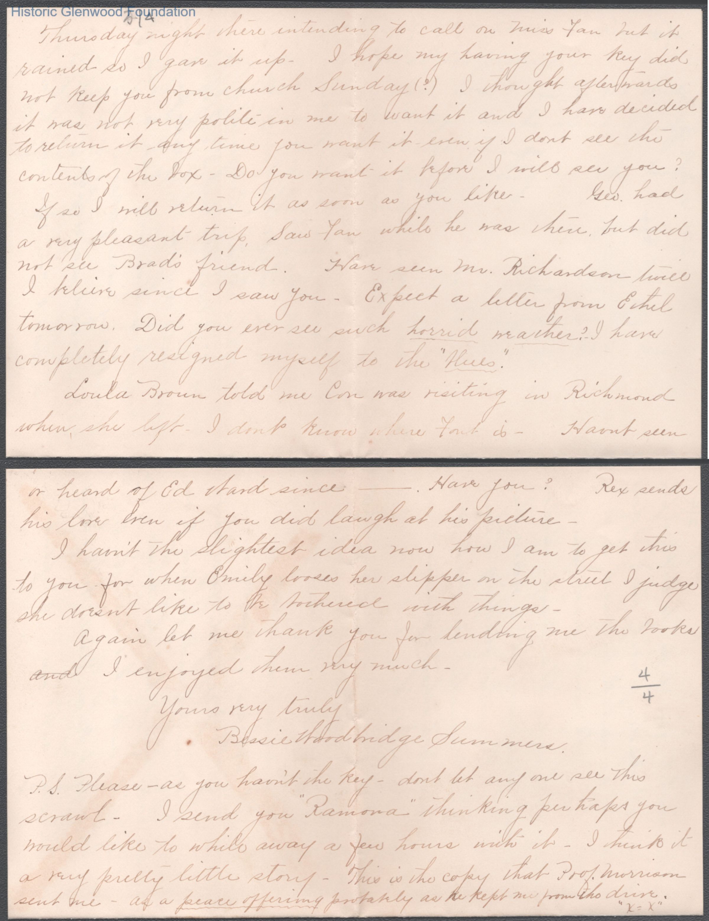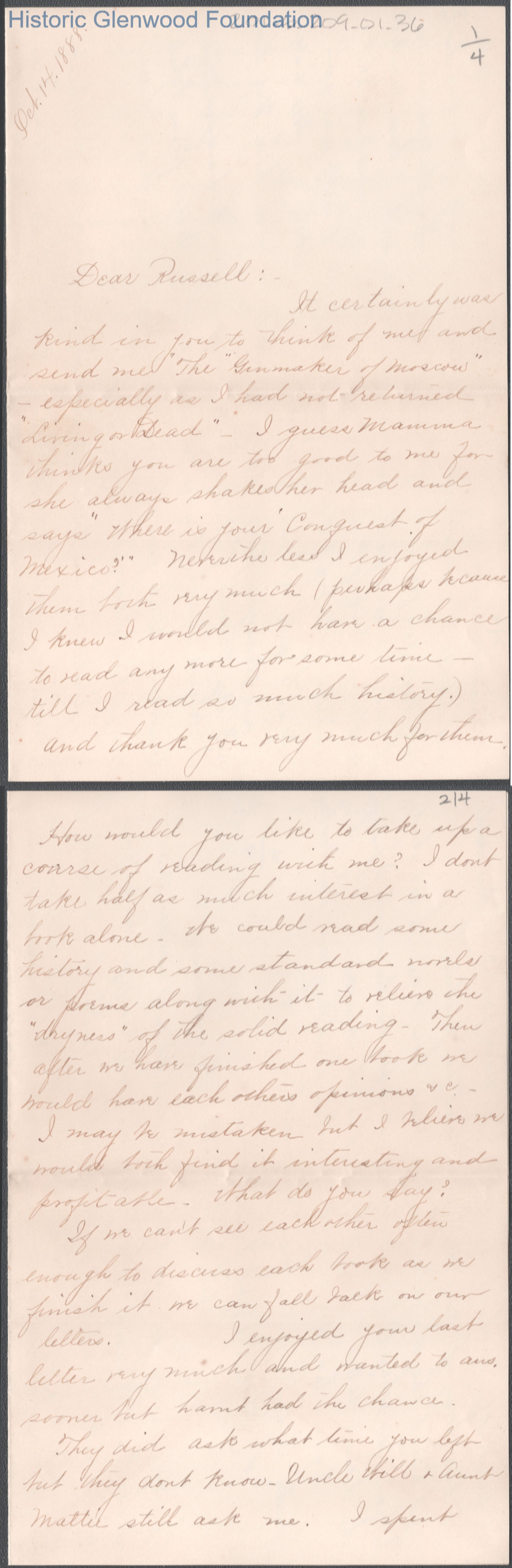 Four-page letter to Russell G. Quarrier from Elizabeth S. Quarrier, Oct 14, 1888.