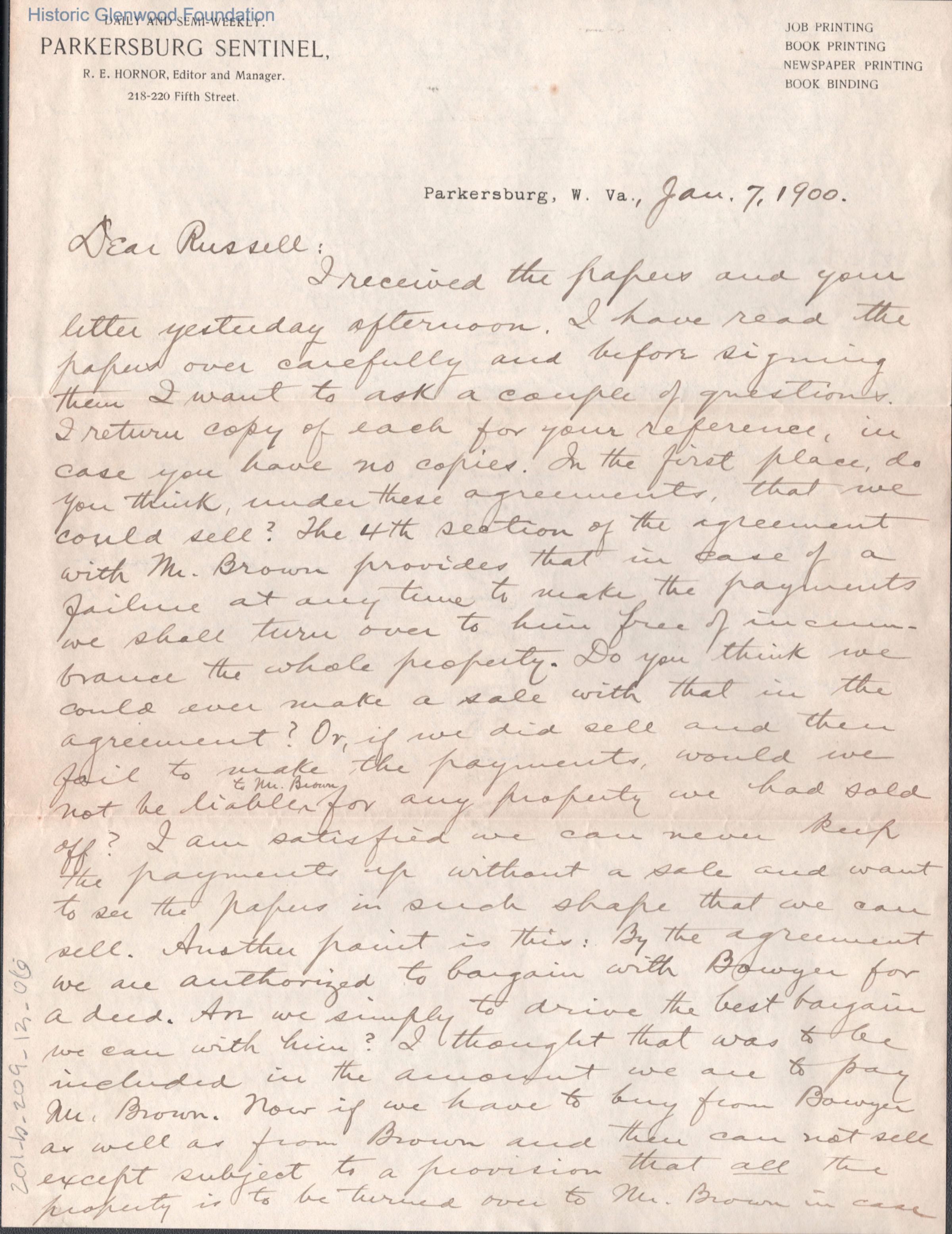 Two-page letter to Russell G. Quarrier from George W. Summers, Jan 7, 1900.