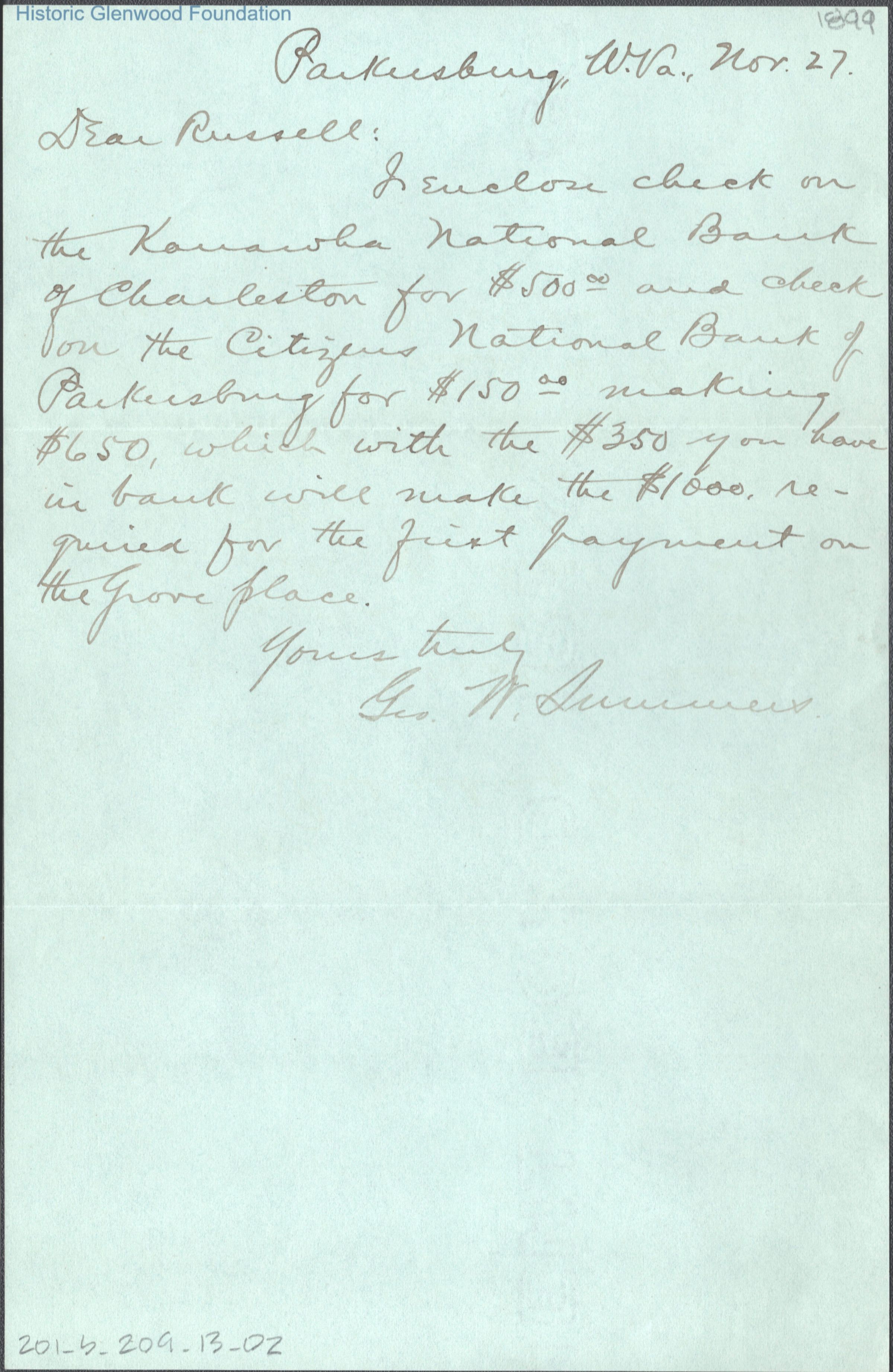 Single page letter to Russell G. Quarrier from George W. Summers, Nov 27, 1899.