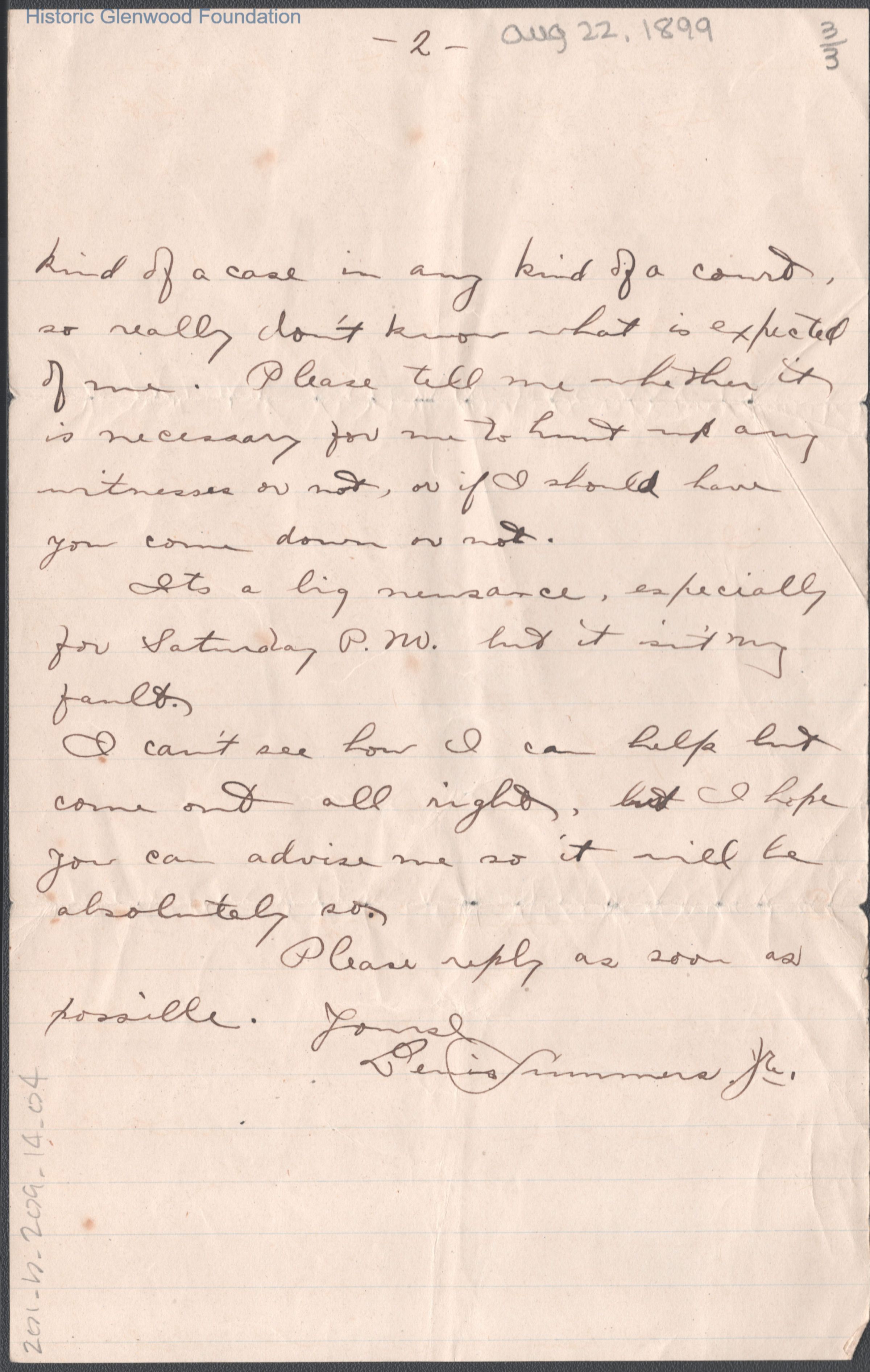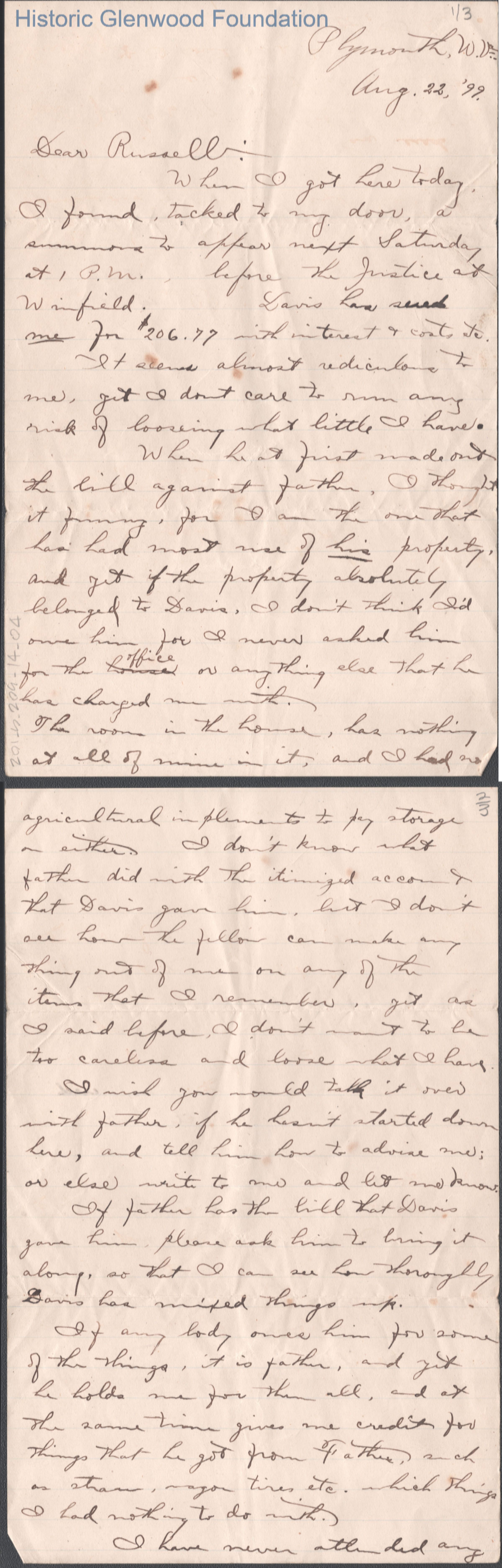 Three-page letter to Russell G. Quarrier from Lewis Summers, Jr., Aug 22, 1899.
