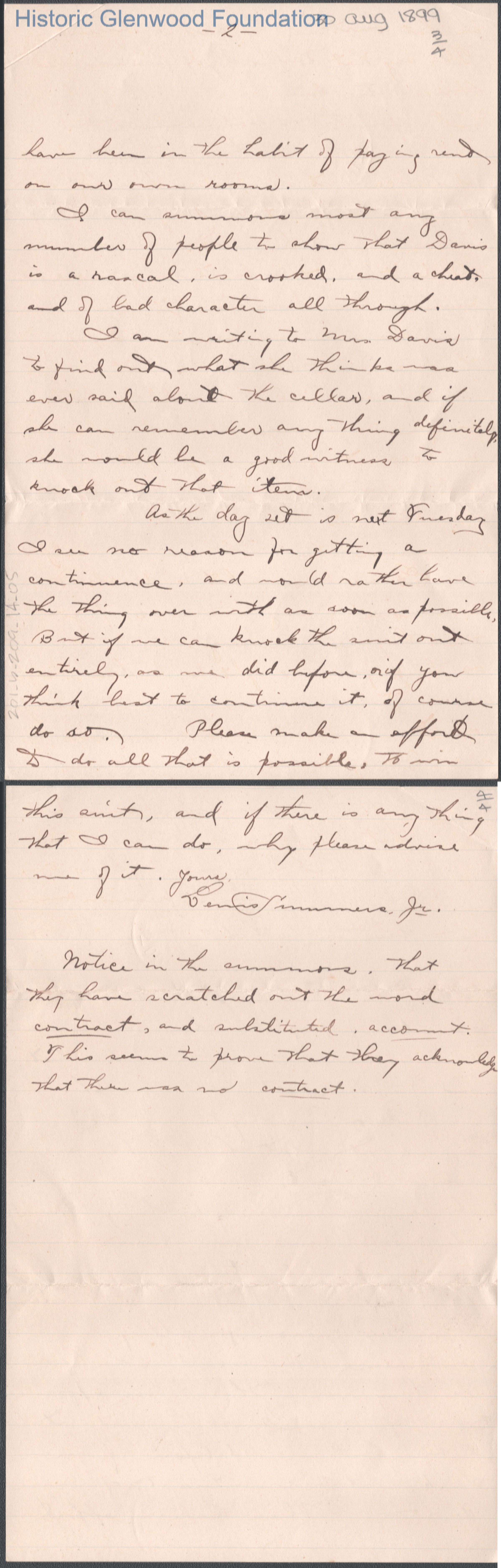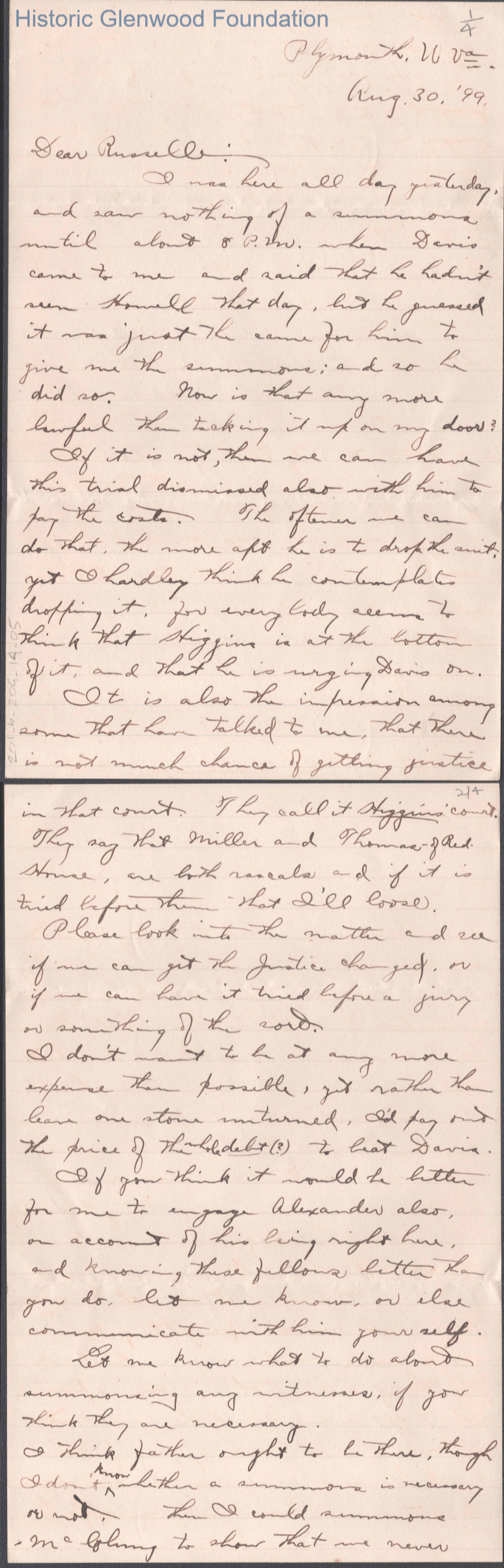 Four-page letter to Russell G. Quarrier from Lewis Summers, Jr., Aug 30, 1899.