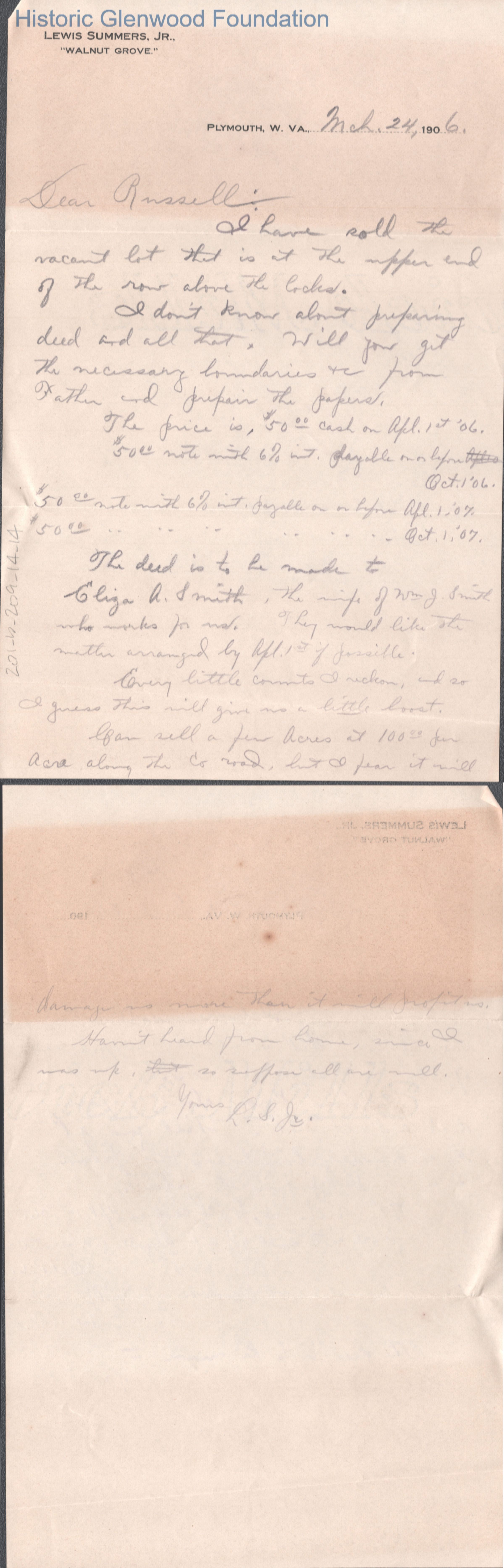 Two-page letter to Russell G. Quarrier from Lewis Summers, Jr., Mar 24, 1906.