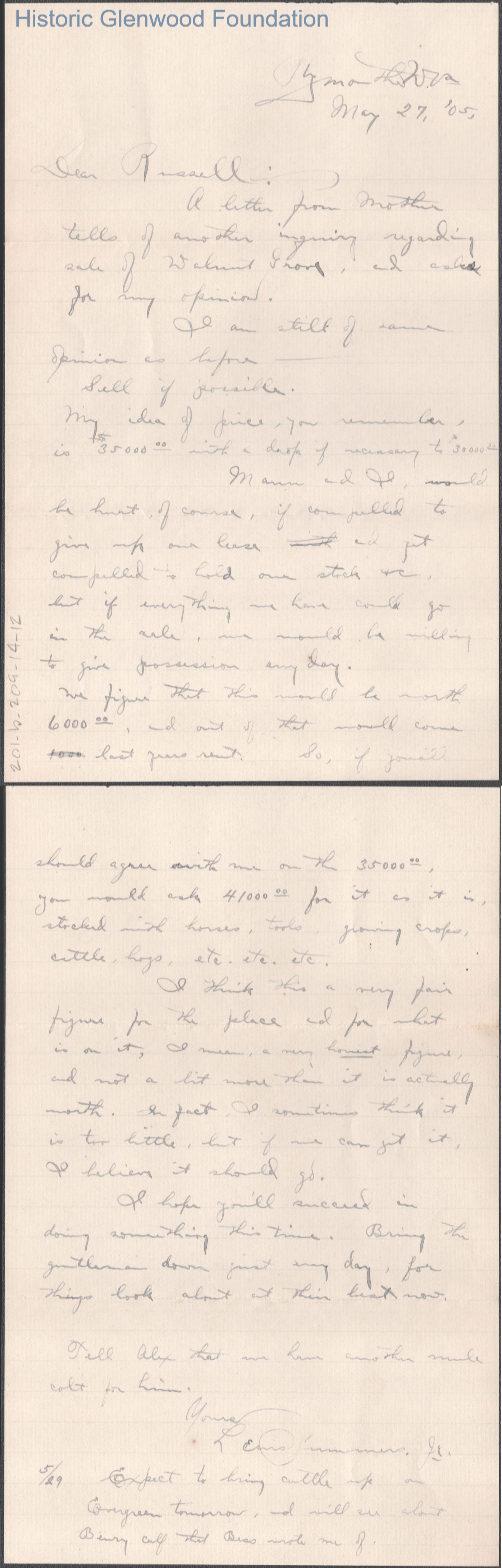 Two-page letter to Russell G. Quarrier from Lewis Summers, Jr., May 27, 1905.