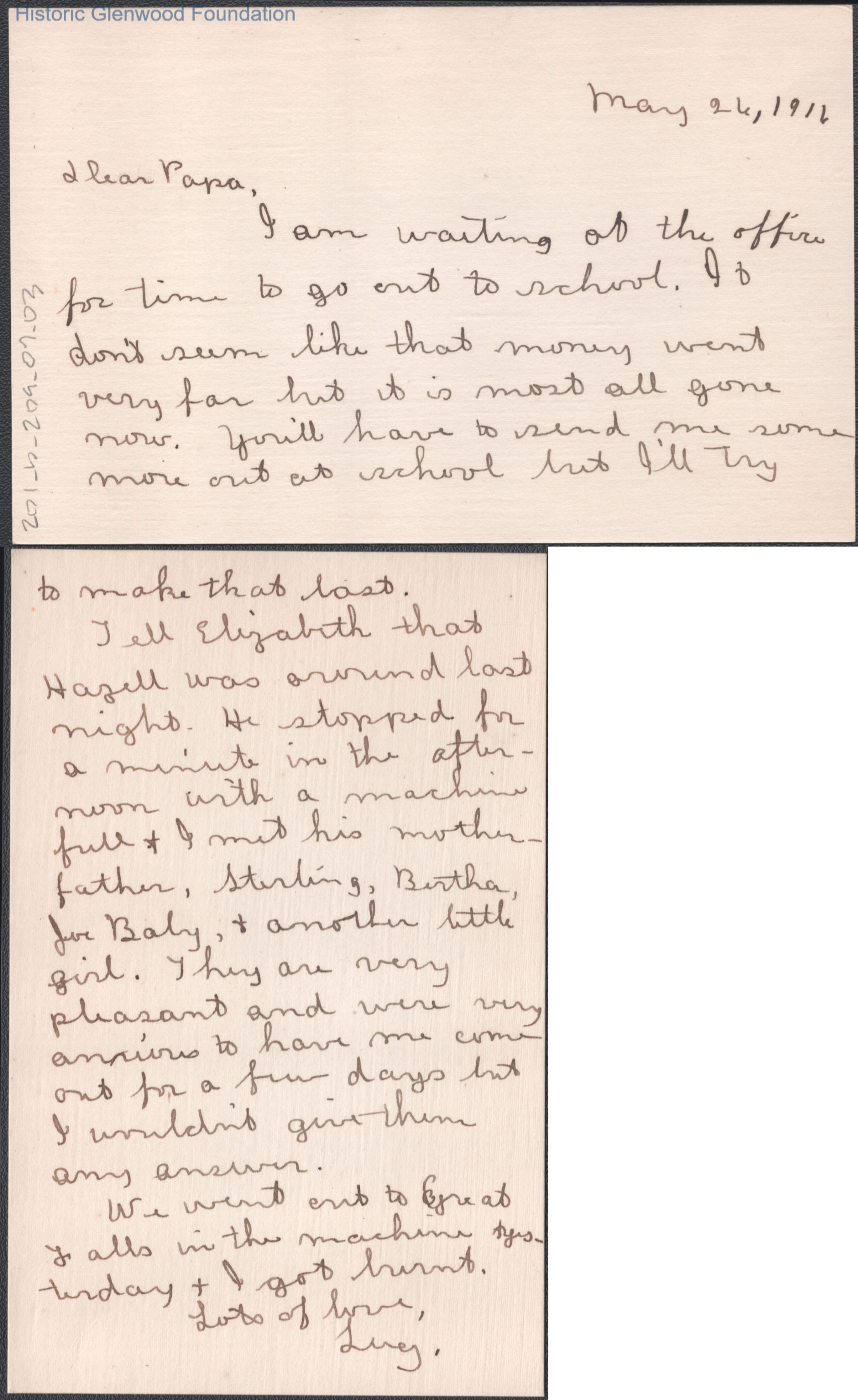 Two-page letter to Russell G. Quarrier from daughter Lucy S. Quarrier, May 26, 1916.