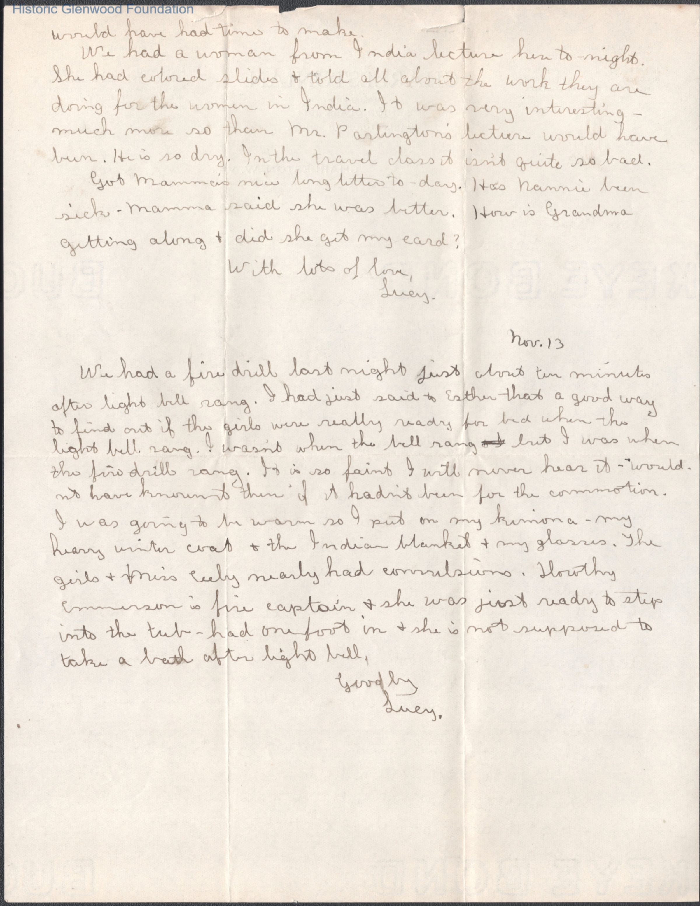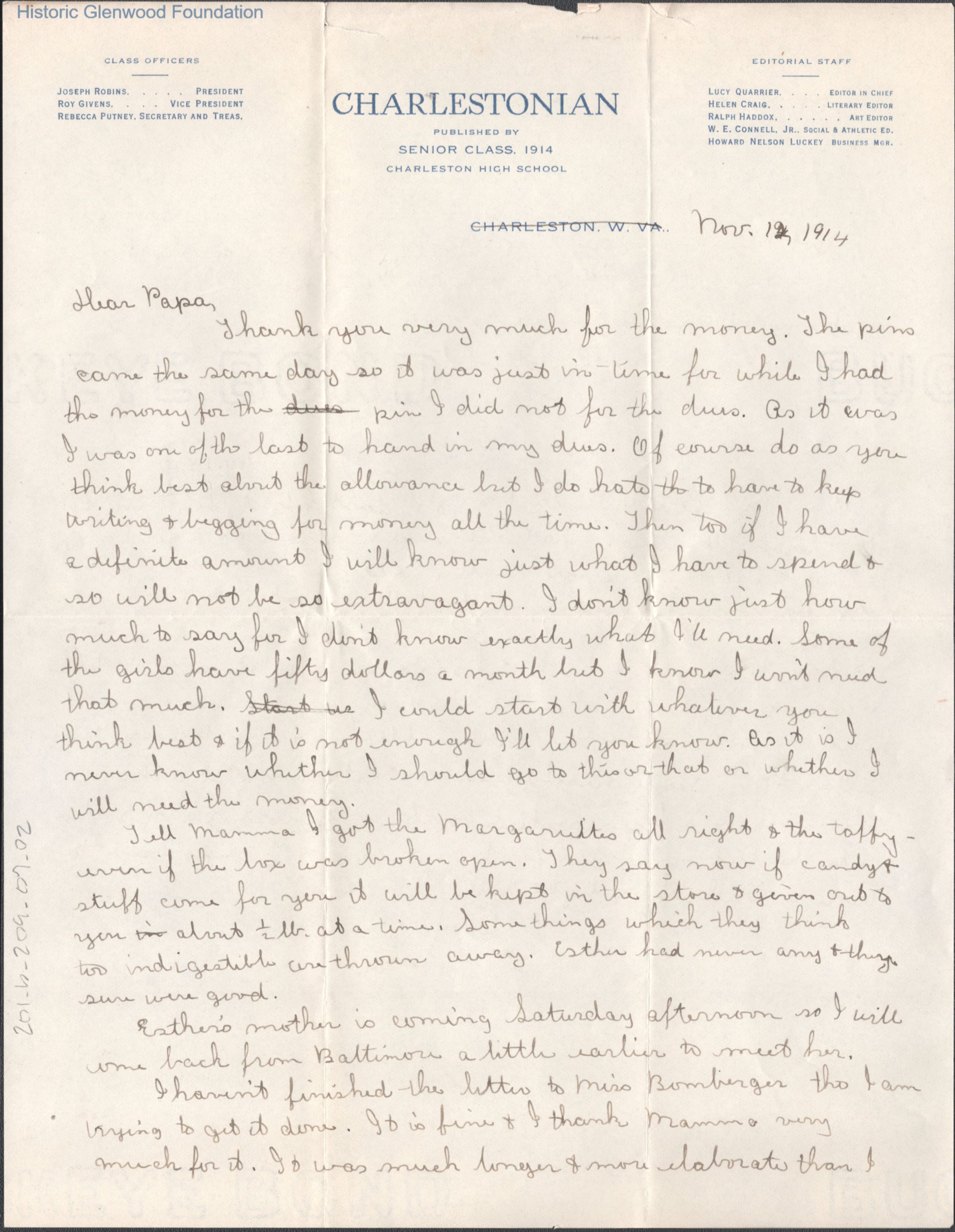 Two-page letter to Russell G. Quarrier from daughter Lucy S. Quarrier, Nov 12, 1914.