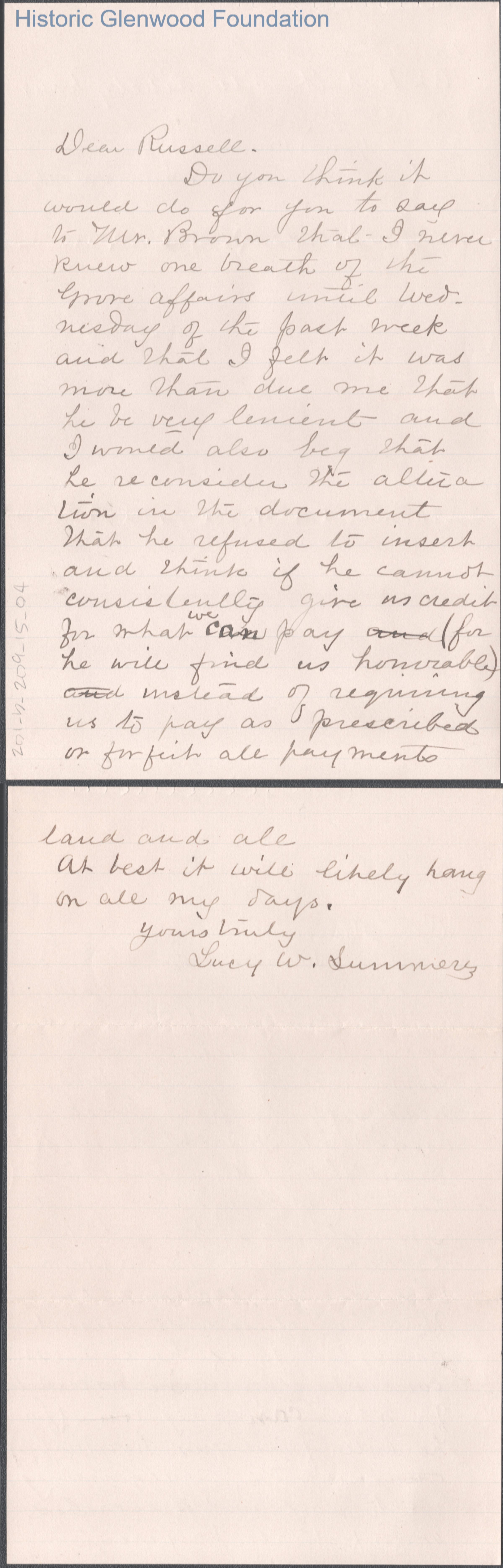 Two-page letter to Russell G. Quarrier from Lucy W. Summers, unknown date.