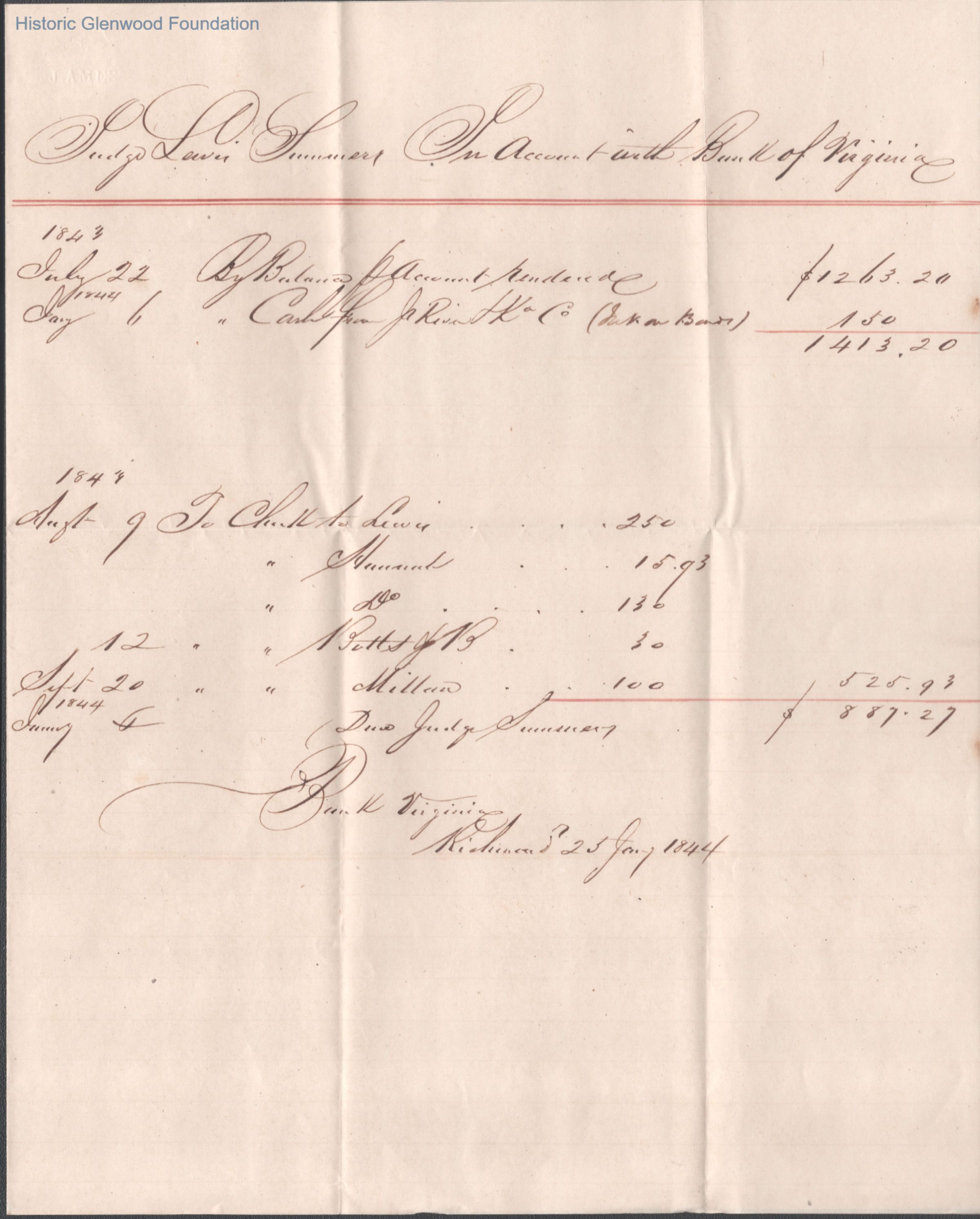 Statement of account with Bank of Virginia, 1843-1844