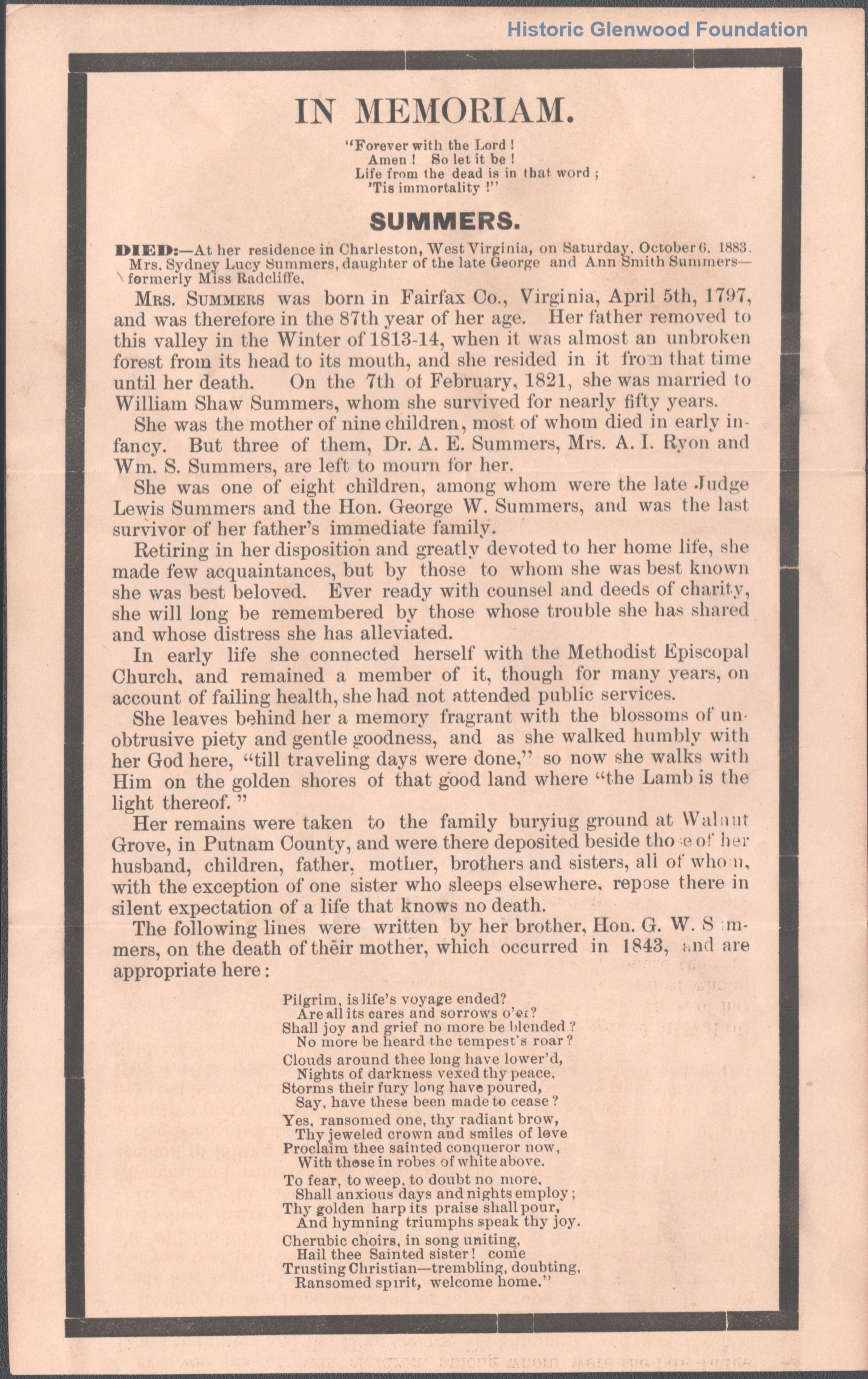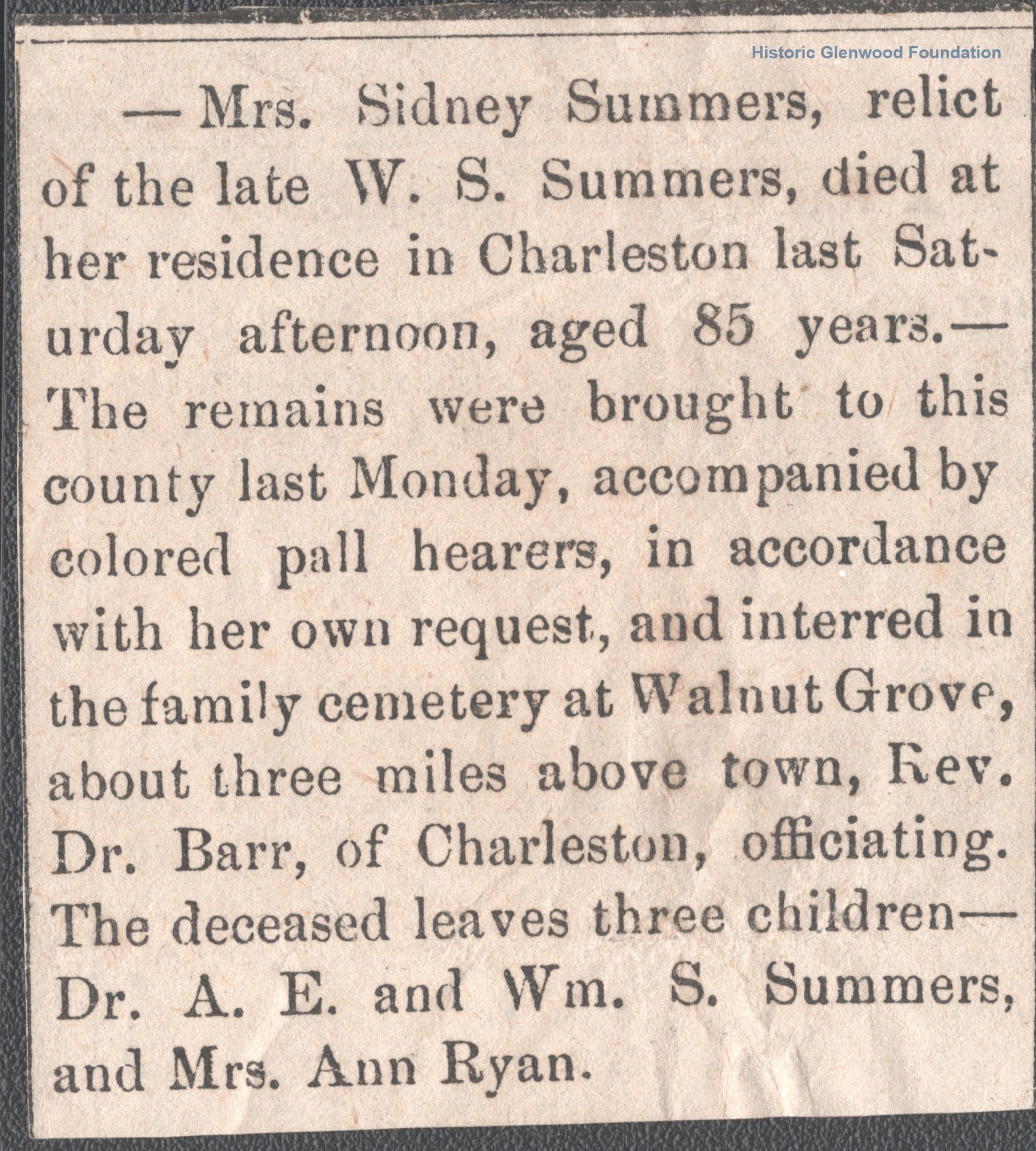 Sydney Lucy Summers Summers, obituary, two versions, Oct. 6, 1883