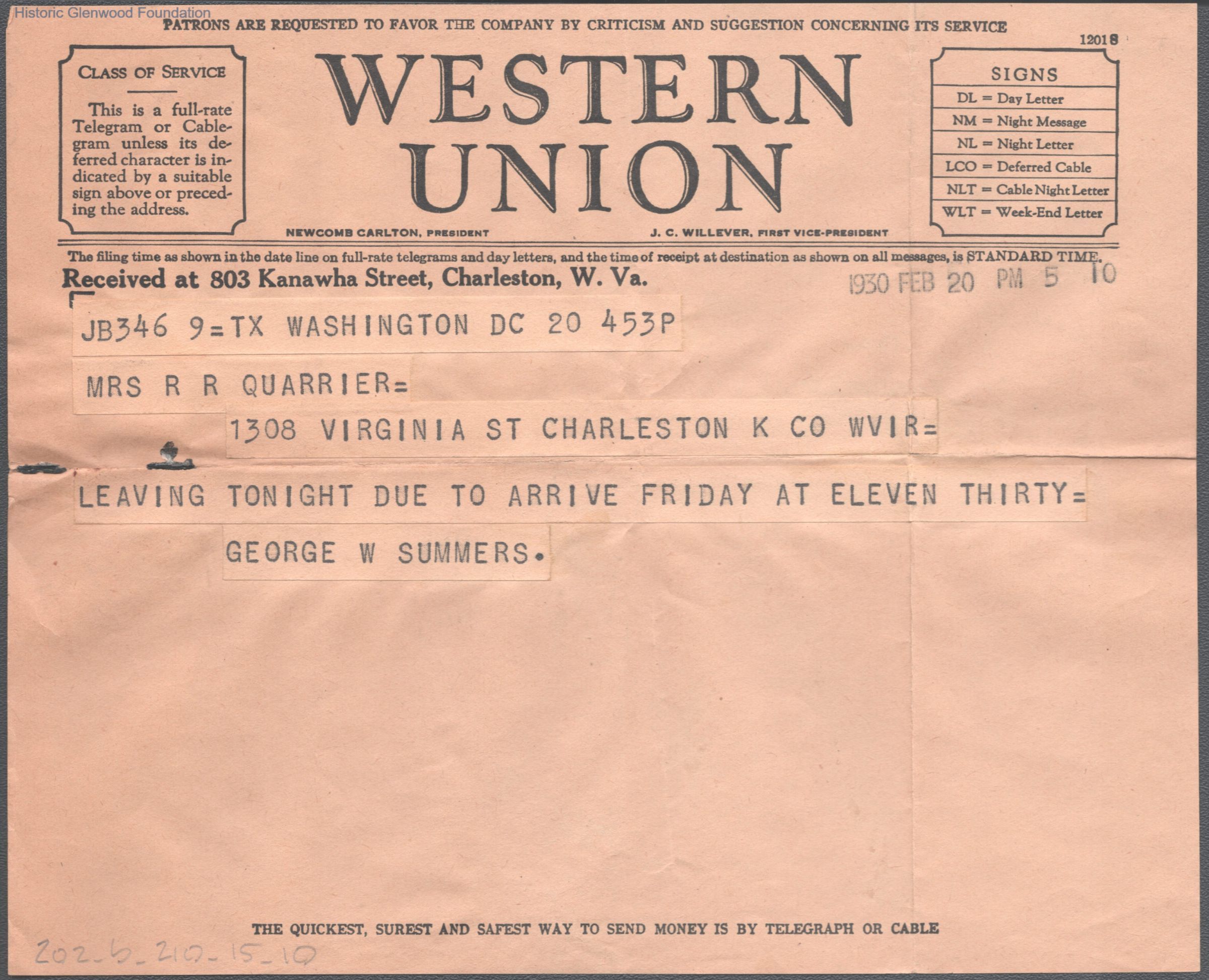 Telegram to Elizabeth S. Quarrier from George W. Summers, Feb 20, 1930