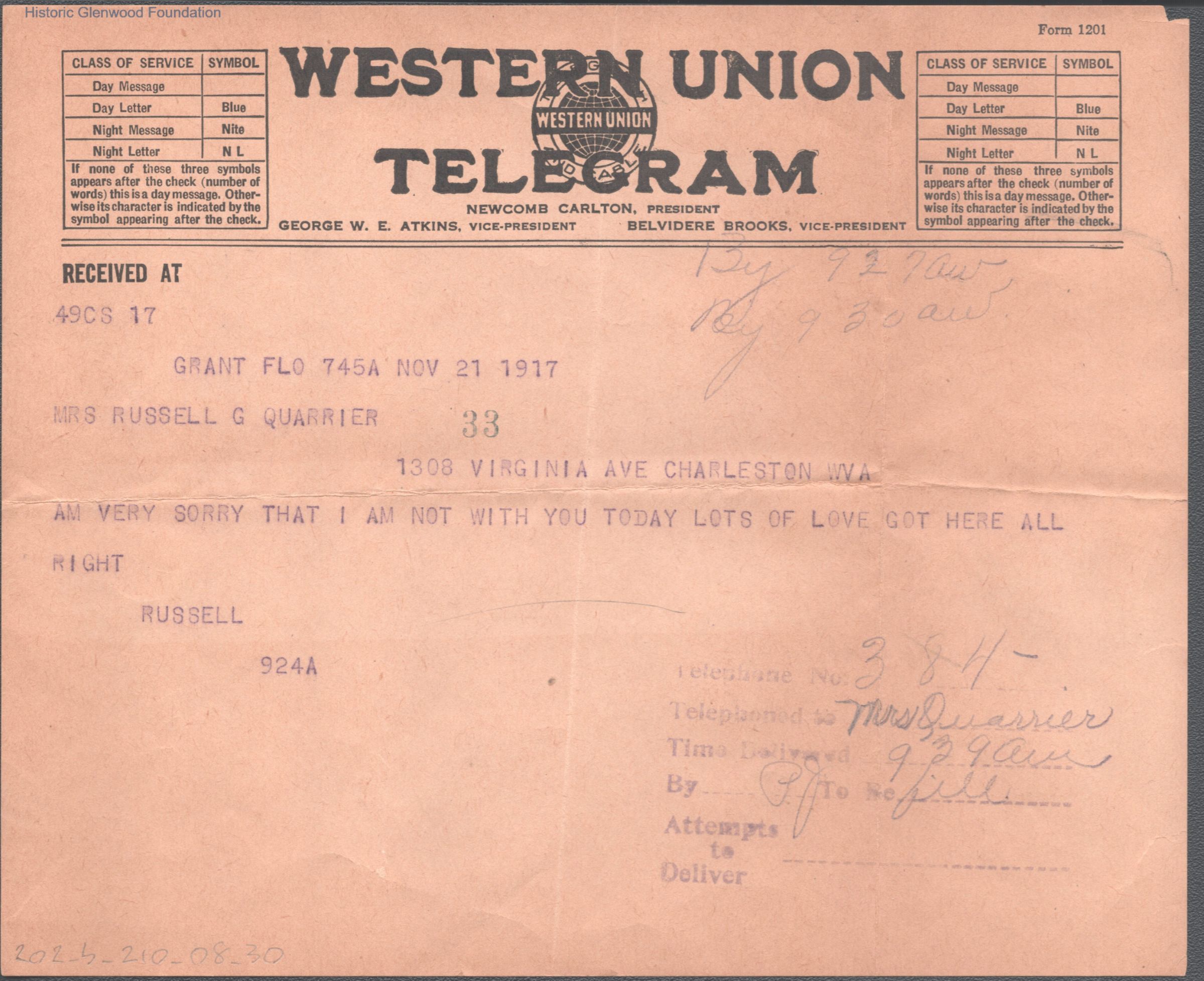 Telegram to Elizabeth S. Quarrier from Russell G. Quarrier, Nov 21, 1917.