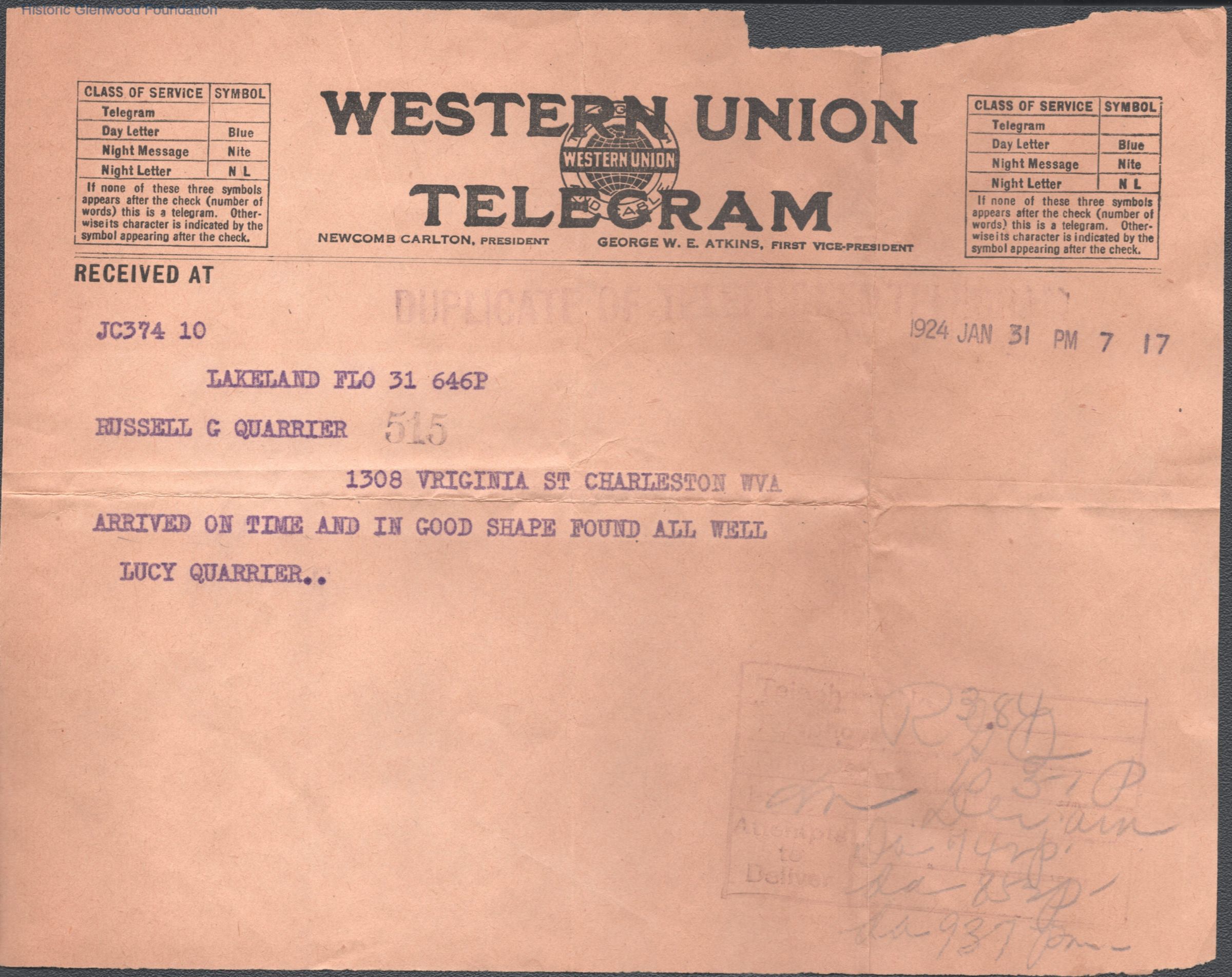 Telegram to Russell G. Quarrier from daughter Lucy S. Quarrier, Jan 31, 1924.