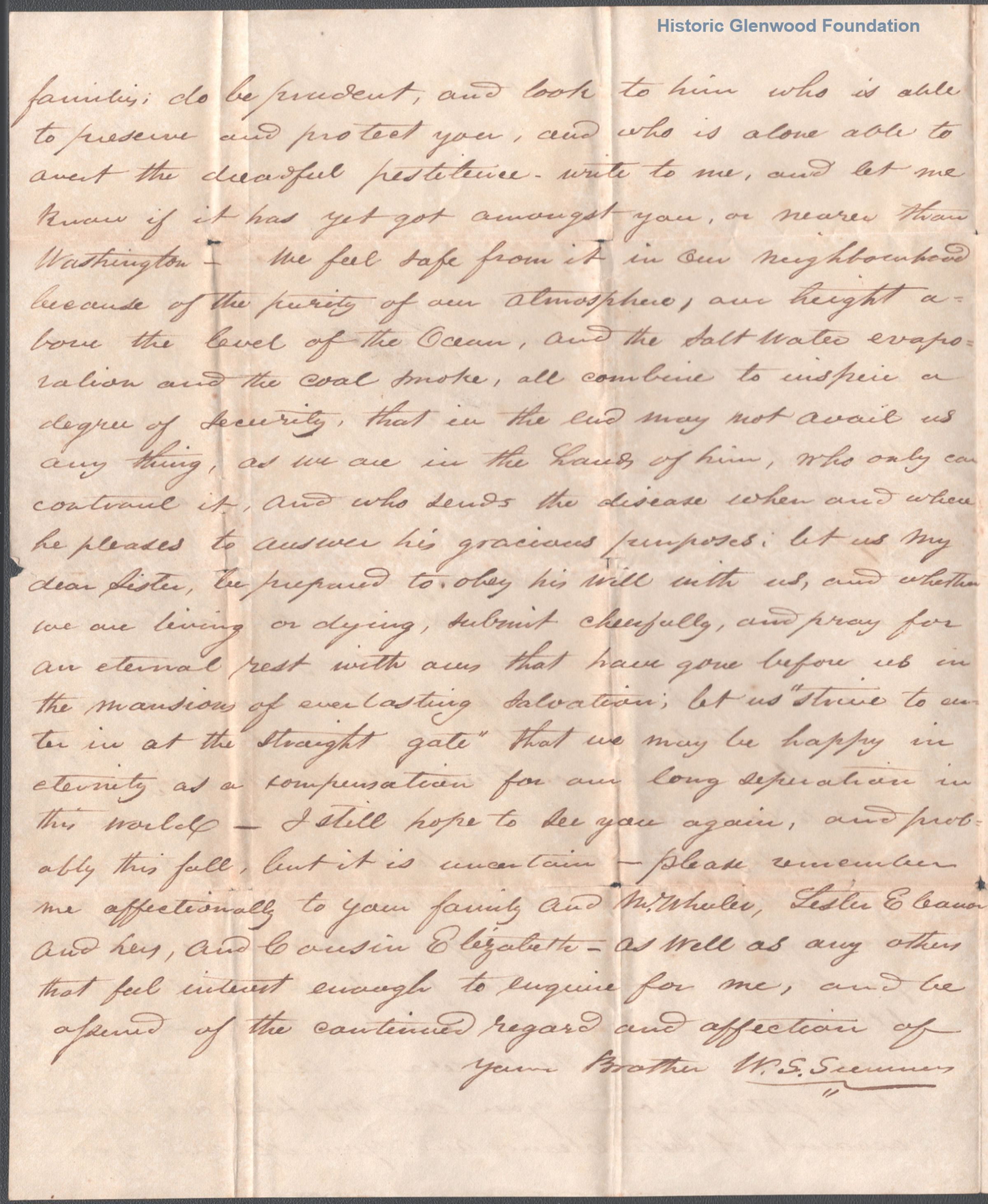 Two page letter from William S. Summers to sister, Jane E. Wheeler