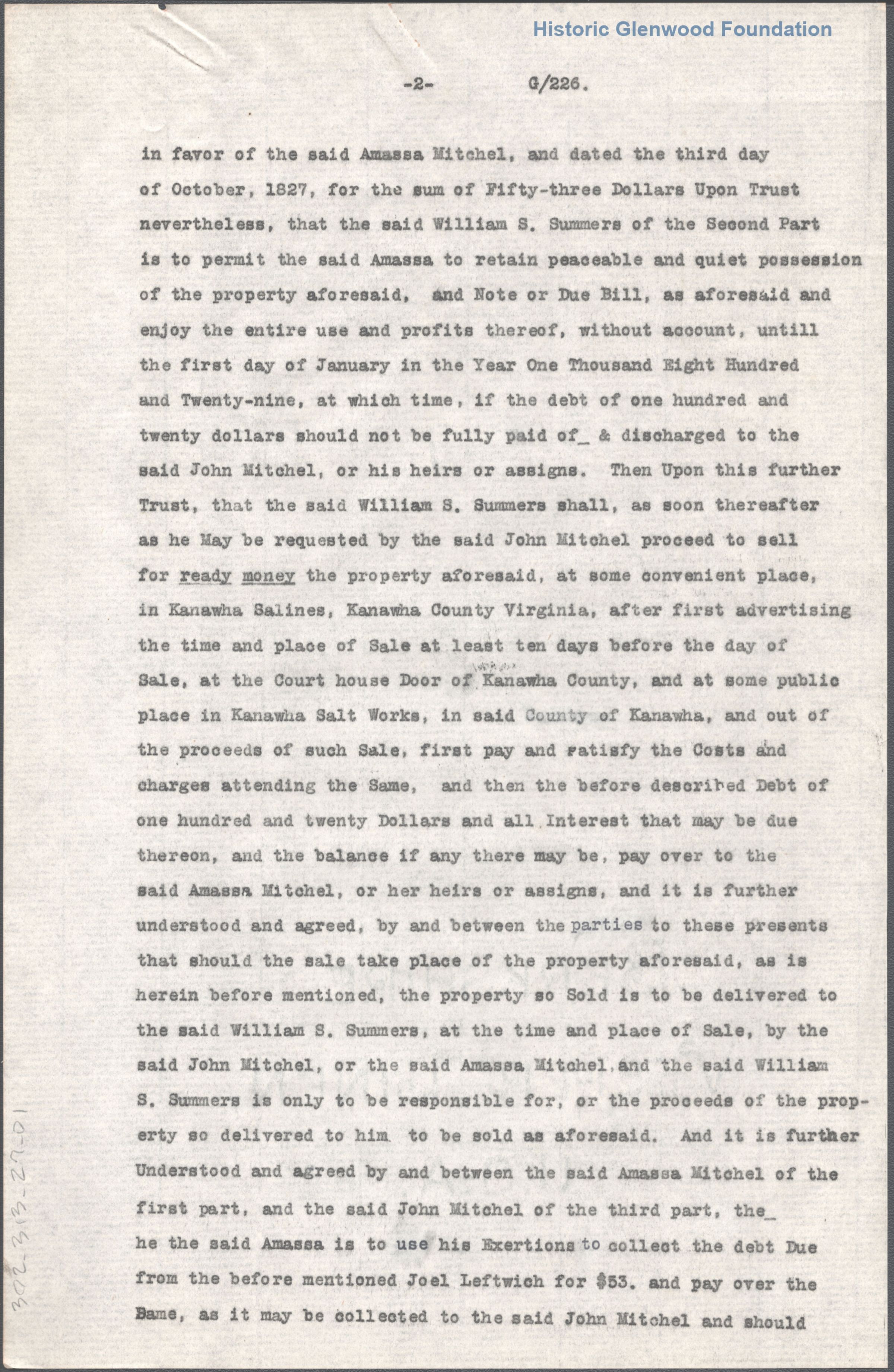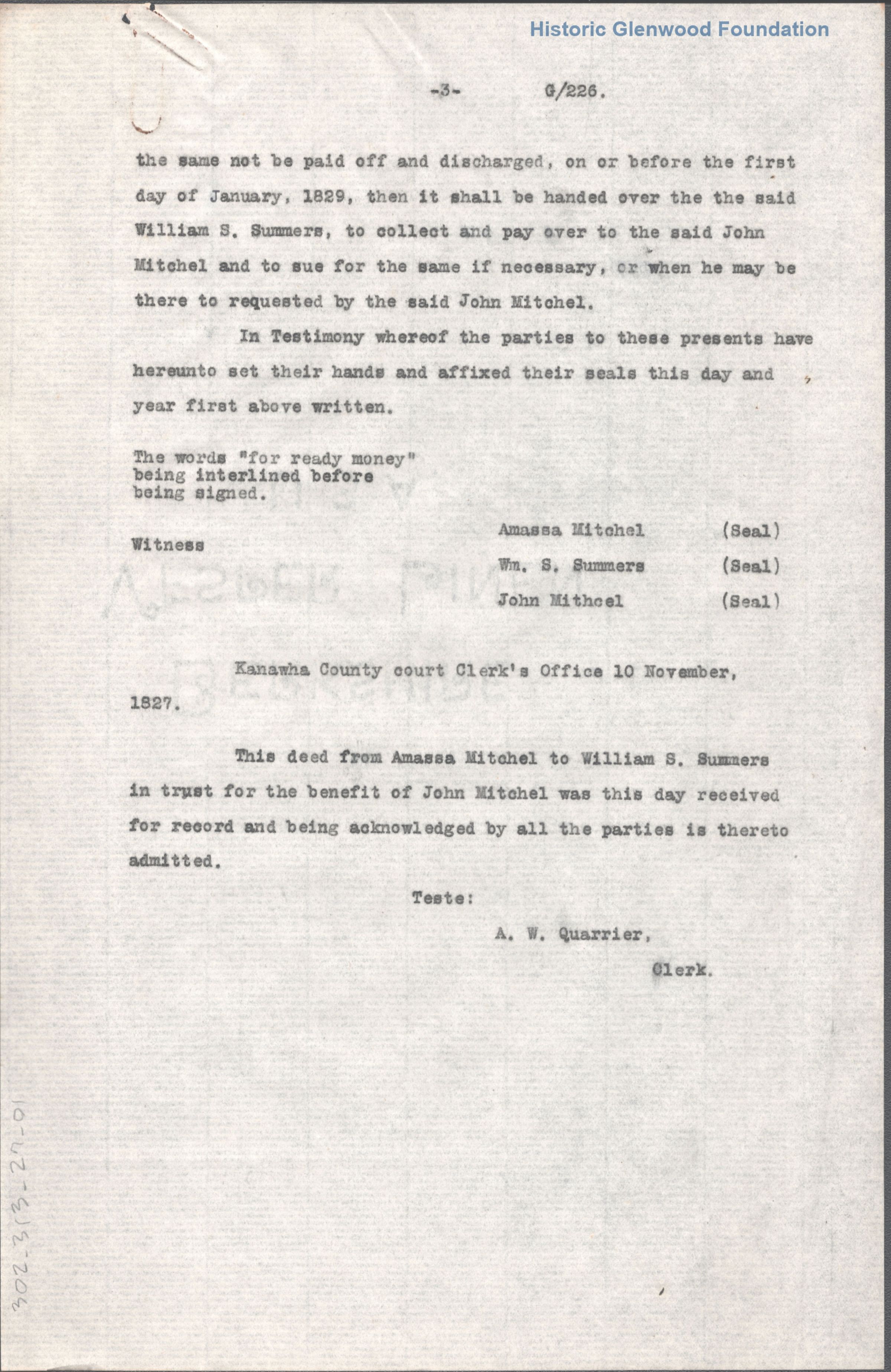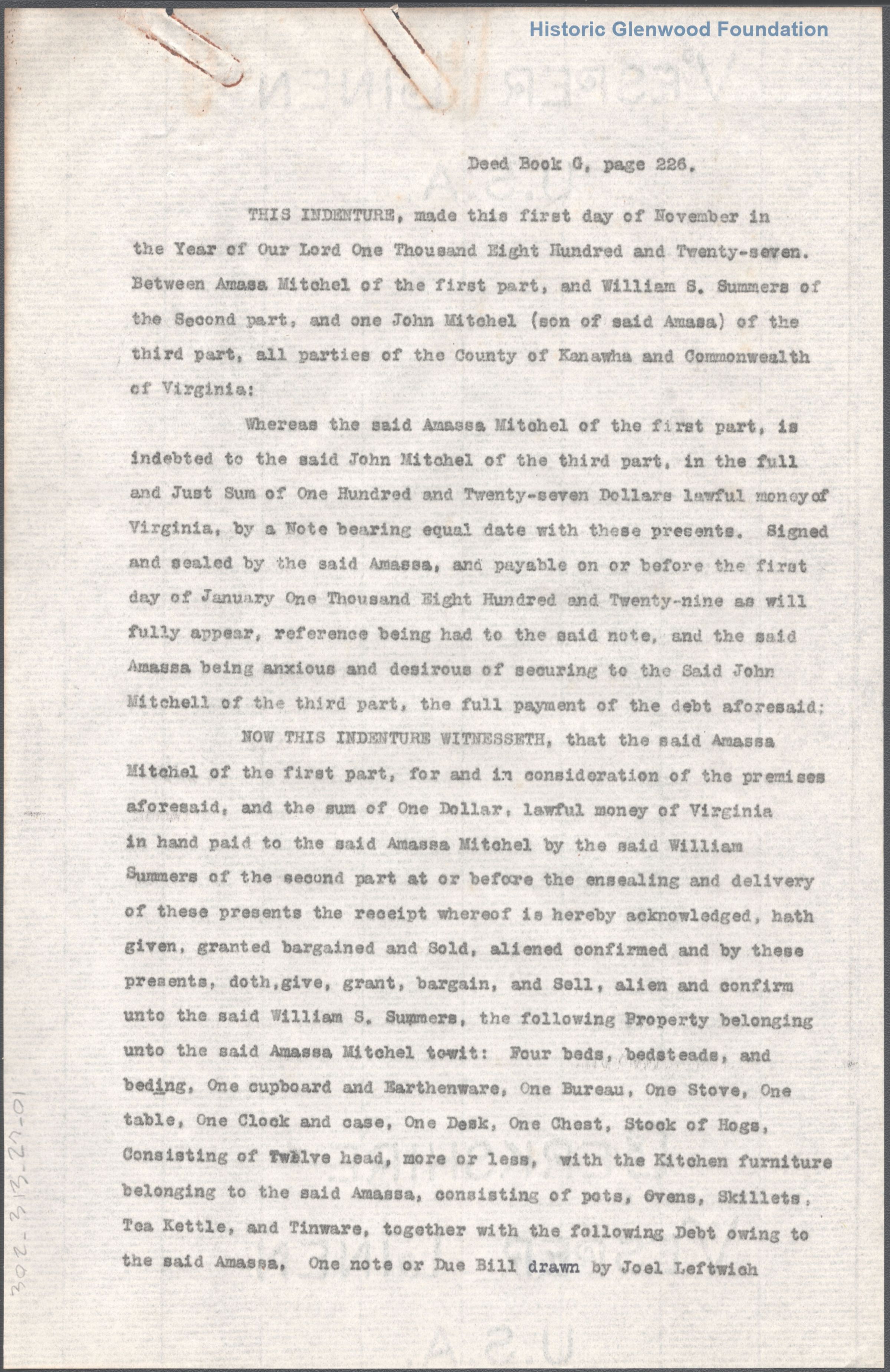 William Shaw Summers, trust agreement with Amasa & John Mitchel, 1827