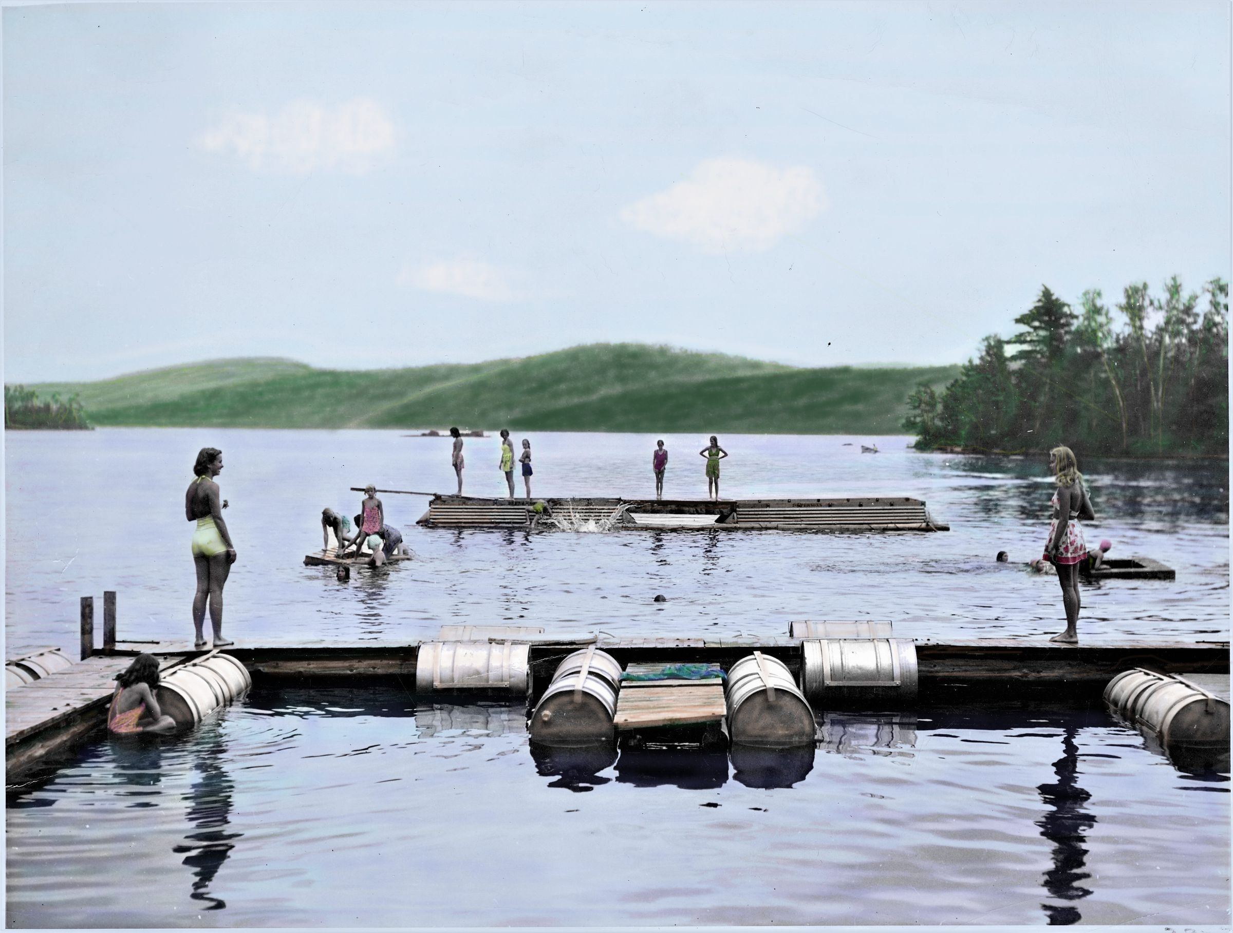 Colorized BXW photograph from Hill Camp Collection of photographs, unidentified photographer and campers, c. 1940's, colorized and printed on canvas for "Summer in Harrisville" Exhibit in Harrisville General Store August 2023.