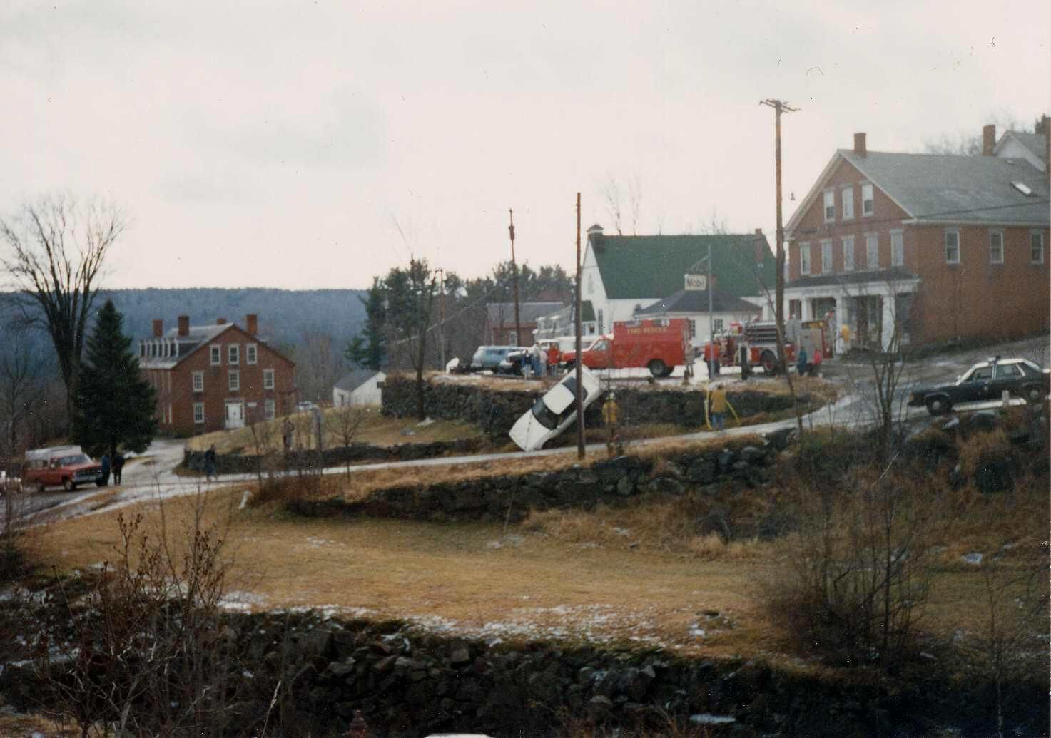 Color Print Car rolled over the wall before the fence was installed in front of the General Store. Child in car was unharmed. Taken from the front yard of the Harris Boardinghouse.
