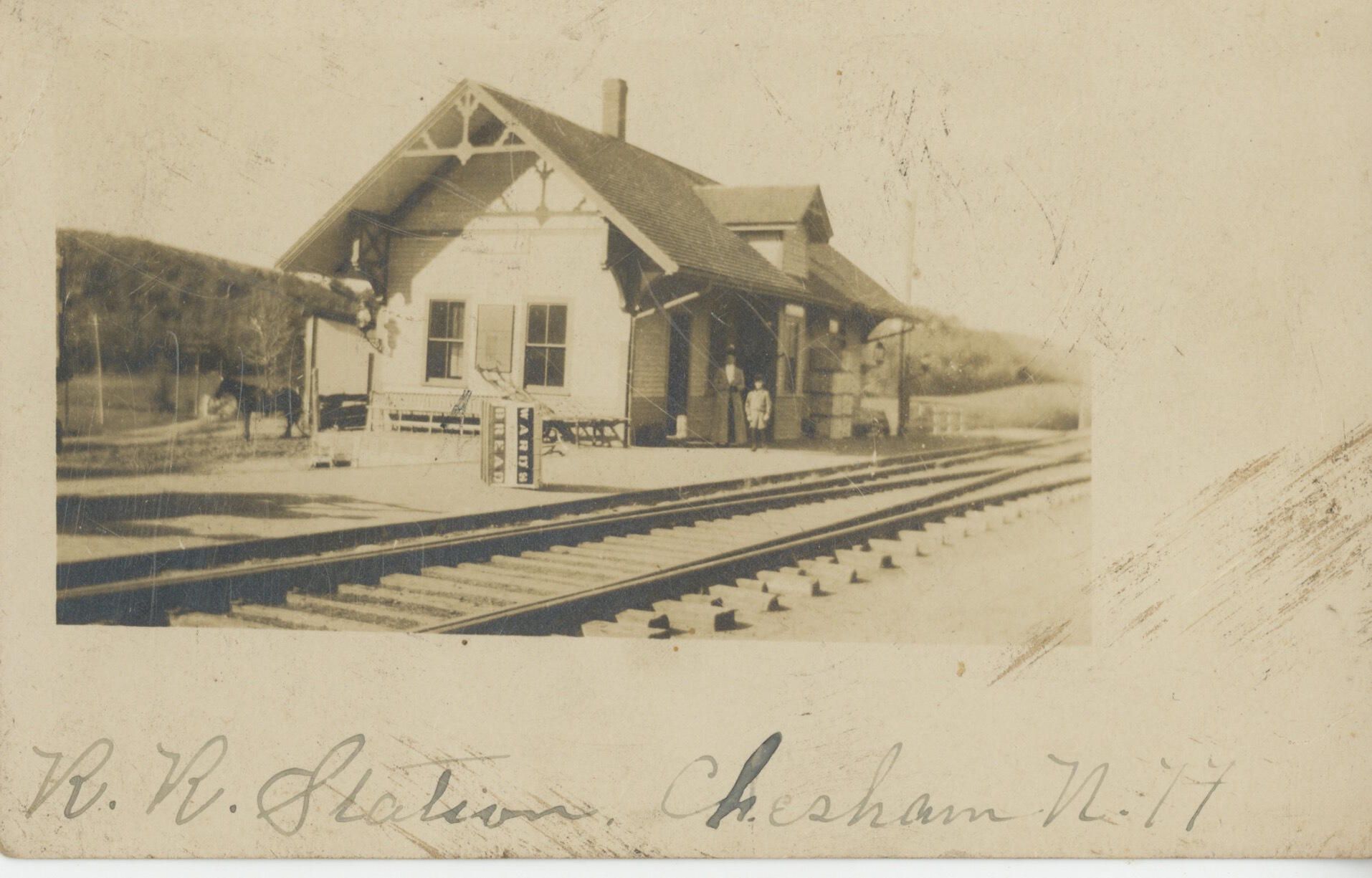 Digital photo sent via email of Chesham Depot with horse tied nearby and two persons standing in doorway. Ward's Bread box by track. Copy of 2018.001.005