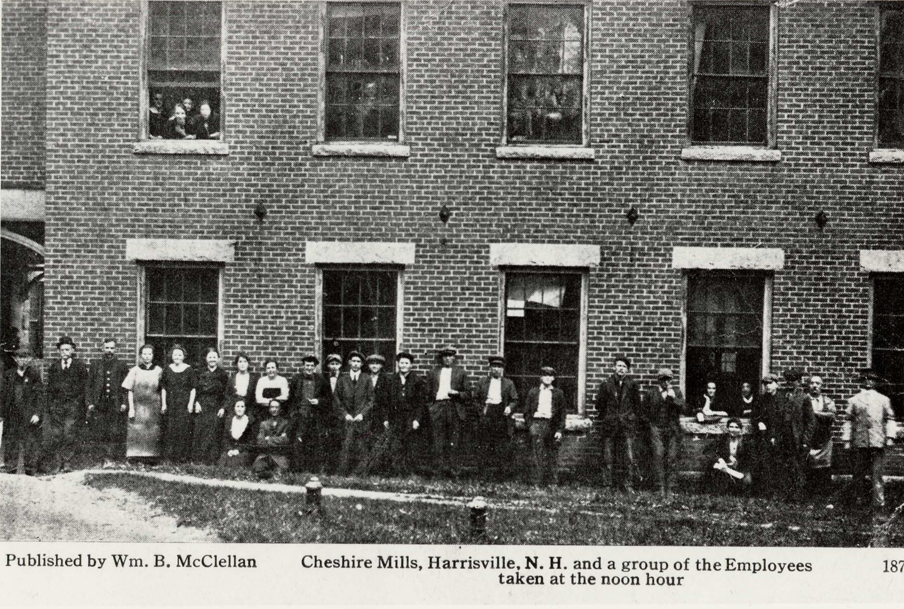 B & W enlarged print of a postcard Cheshire Mills employees in front of building #2 and in the windows at noon hour. Vantage: looking north in front of building #2.