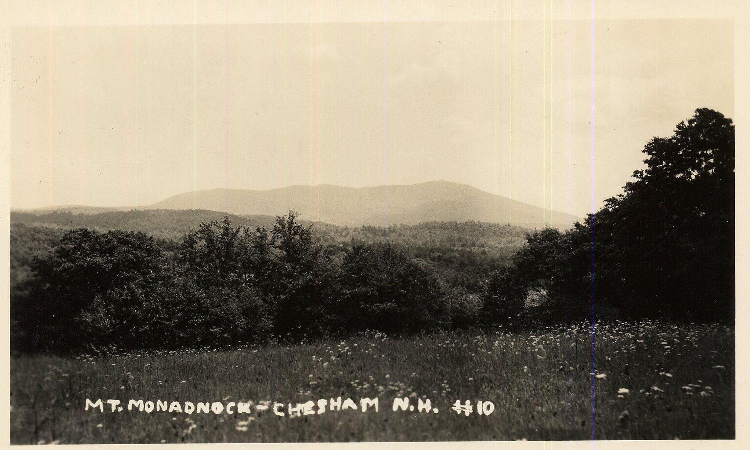 B&W photo postcard with view of Mt. Monadnock across field, trees, and more fields.