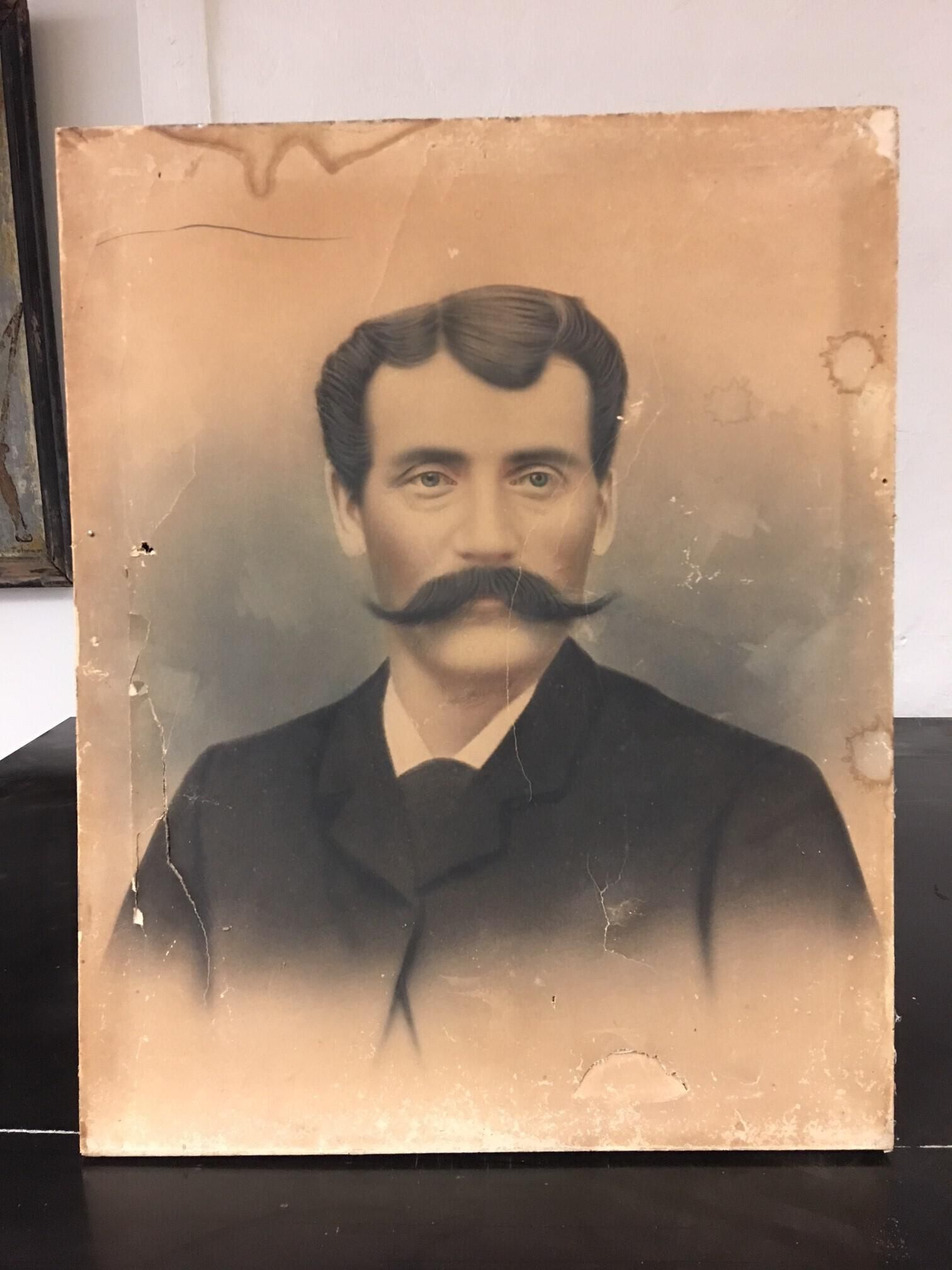 One of two portraits (poss sepias or tinted photos) of a man and woman. Possibly from Bemis? Poor condition.