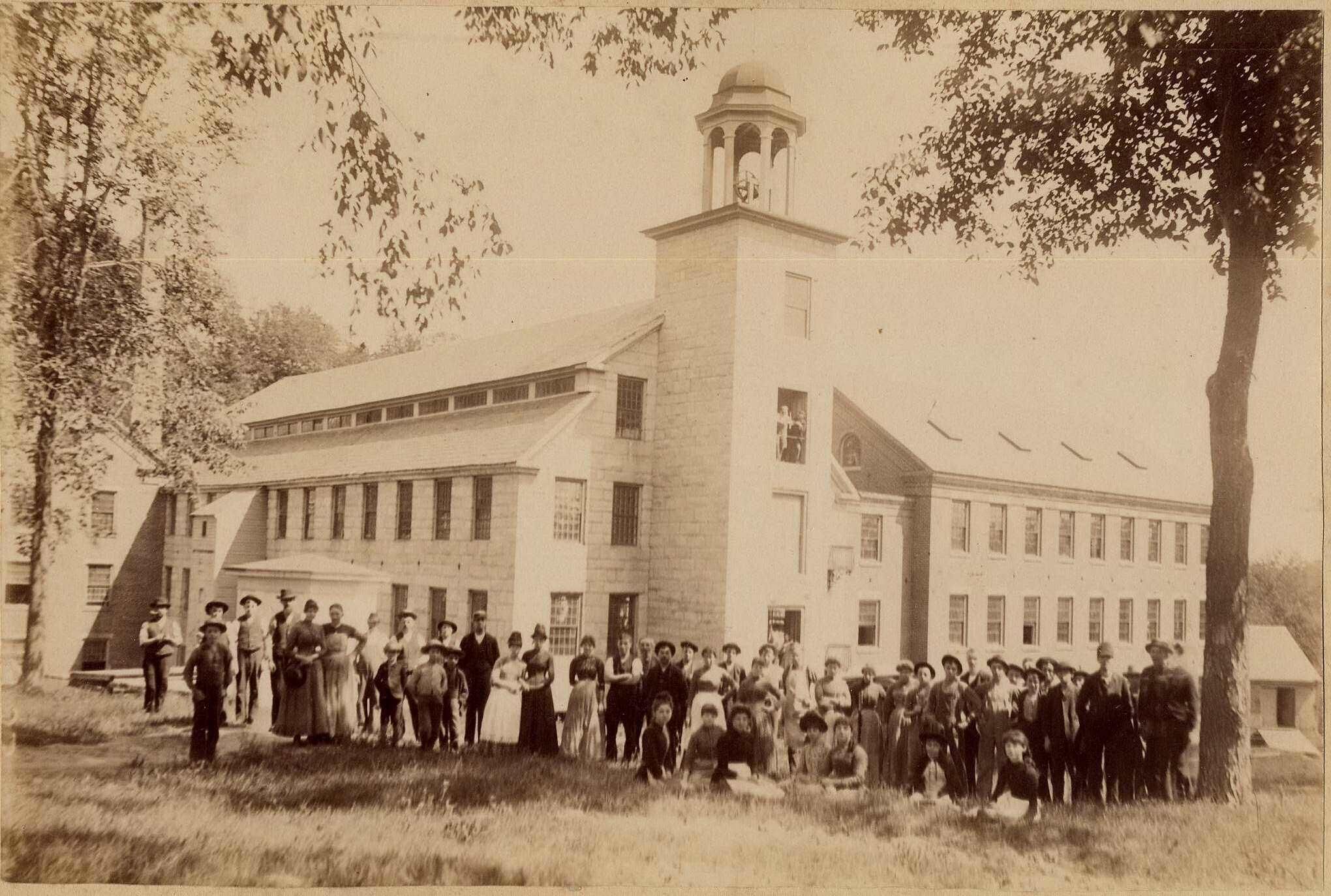 B&W photo Granite Mill Complex focusing on the bell tower with workers posing in the foreground. Date circa 1888.