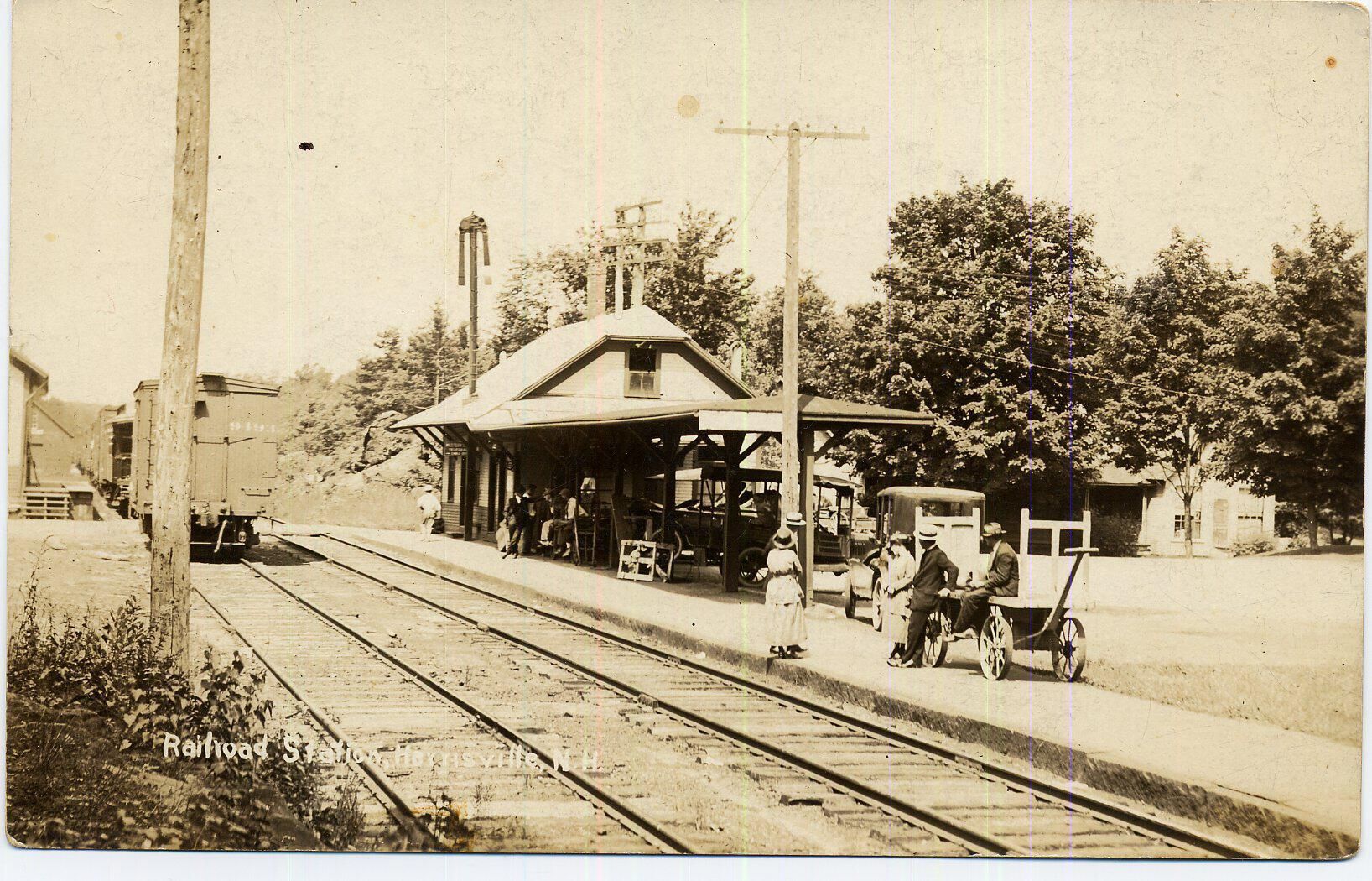 Harrisville Railroad Station with passengers, baggage cart, freight cars