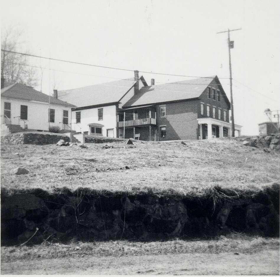 B&W print Harrisville General Store seen from the driveway of the Cheshire Mills Boardinghouse. Clark owner. Vantage: looking northwest