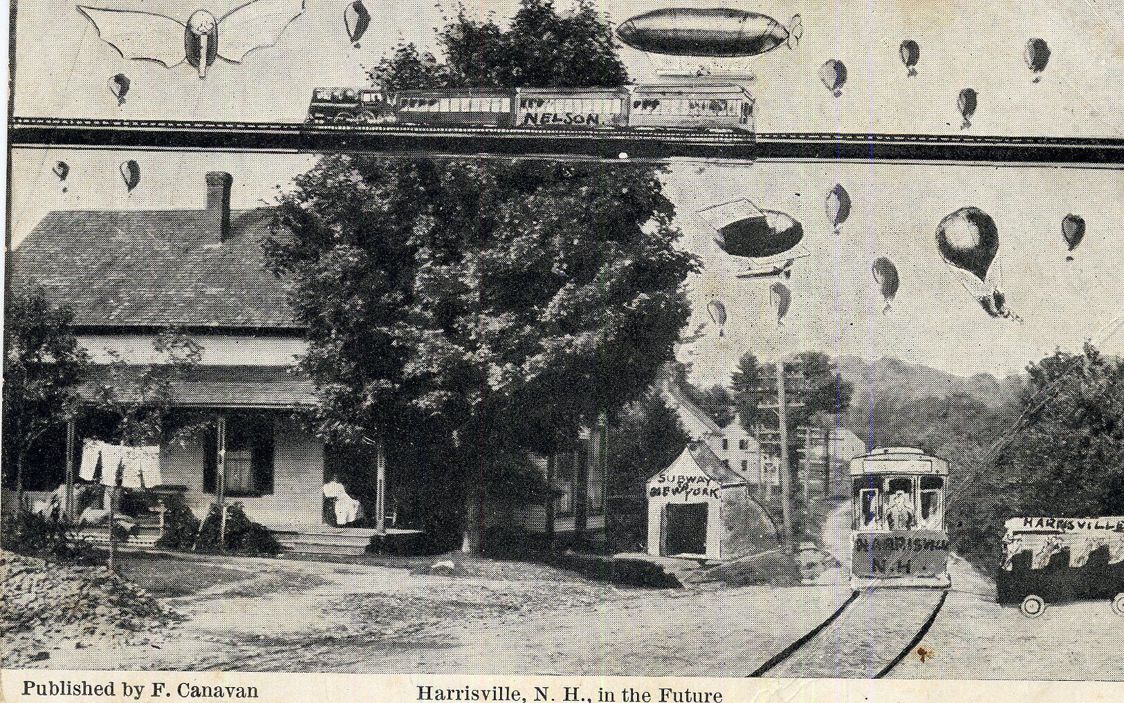 B&W postcard: Harrisville, NH in the Future: zeppelin, balloons, huge bird-plane flying above; Trolley nearby, shed marked "Subway" to New York., Modern RR train marked "Nelson" on elevated tracks above house, below zeppelin. (See also 8x10 copy in photo collection.