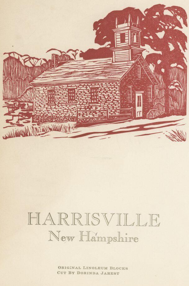 Two identical sheets with two woodcut prints of Harrisville historic buildings: entitled Harrisville, New Hampshire. Original Linoleum Blocks cut by Dorinda Jarest.