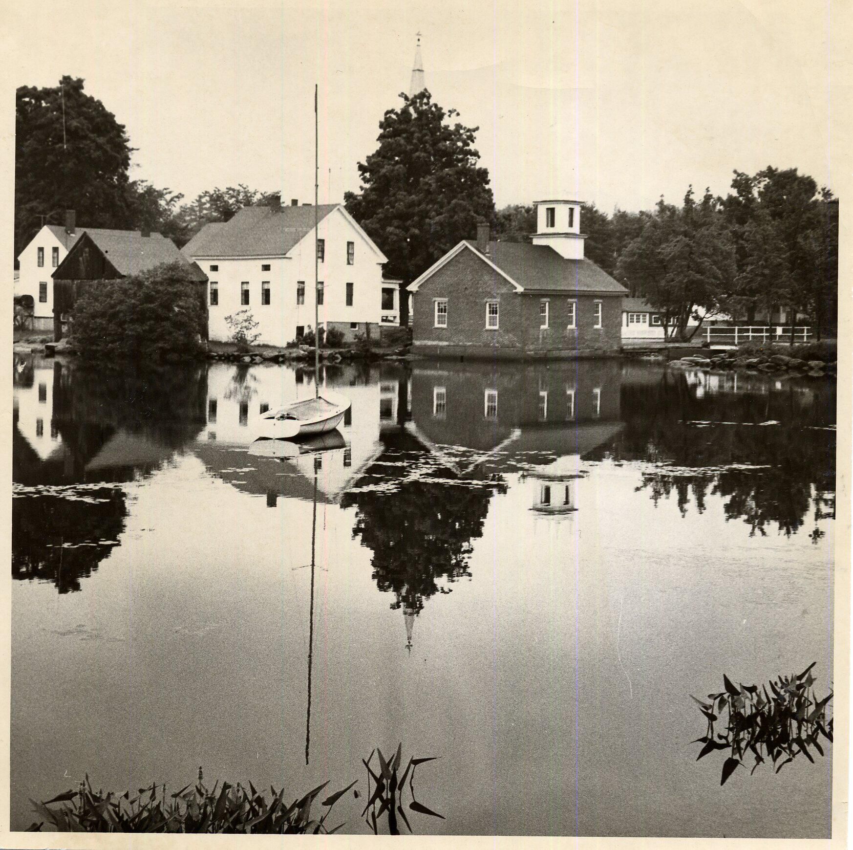 b&w photographic print of Harrisville Village from Harrisville Pond. Rear view of current library and nearby houses reflected in the pond.
