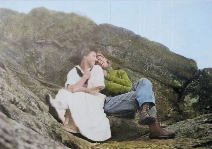 Ruth Day and friend on top of Mt. Monadnock. Original BxW photograph form Fred M. Travis Glass Plate Negative Collection c. 1910, colorized and printed on canvas for "Summer in Harrisville" Exhibit at Harrisville General Store August 2023.