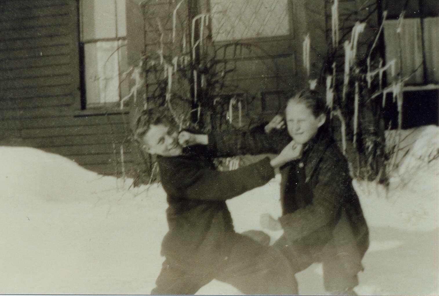 Copy of a B & W print John Johnson and Einey Allo posing in a mock fist fight in front of house in the snow.