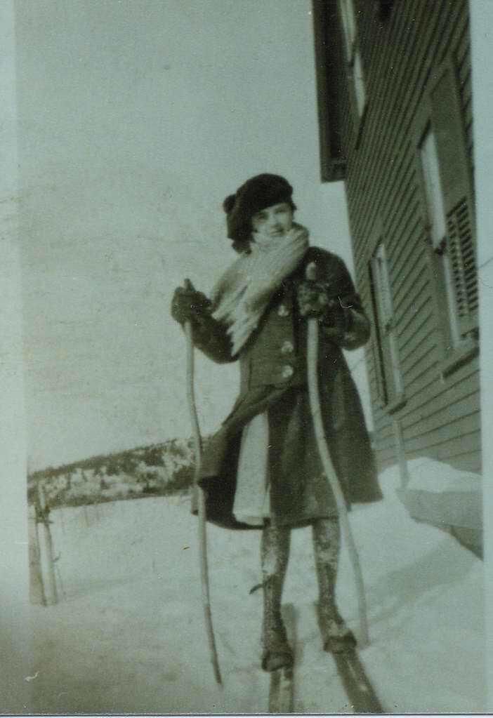 B & W copy of old photo Mamie Marnell posed for a ski run at the Healds (Bollerud) house Vantage: looking along side of the Heald's House