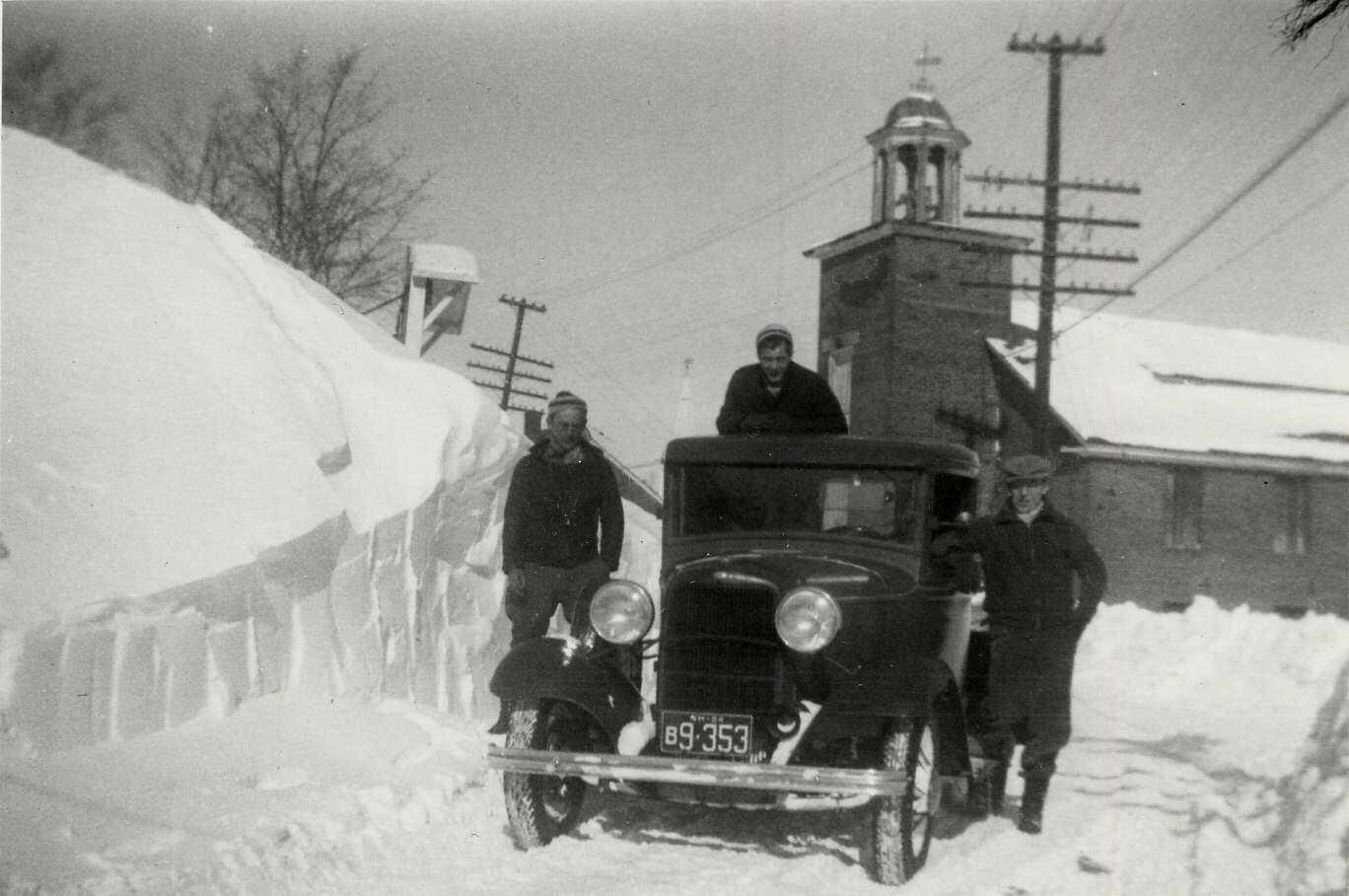 B&W photo View looking up Mill Hill after heavy snowstorm. Model A truck, 3 men and Harris Mill in background. Vantage: center of Mill Hill