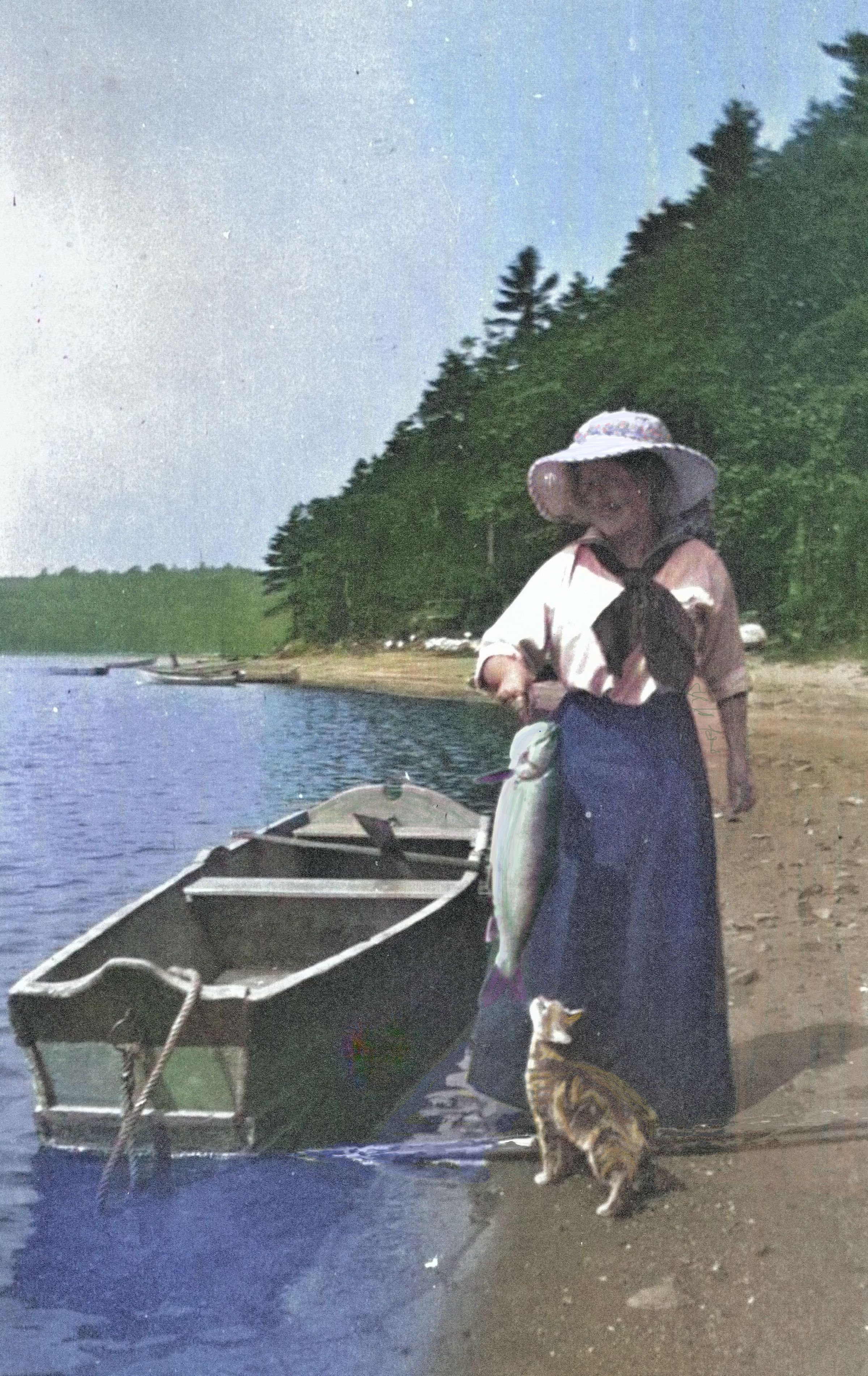 Minnie Bemis with a fish and a curious cat, c 1910, original BxW photo from Bemis Collection, colorized and printed on canvas for "Summer in Harrisville" Exhibit at Harrisville General Store August 2023.