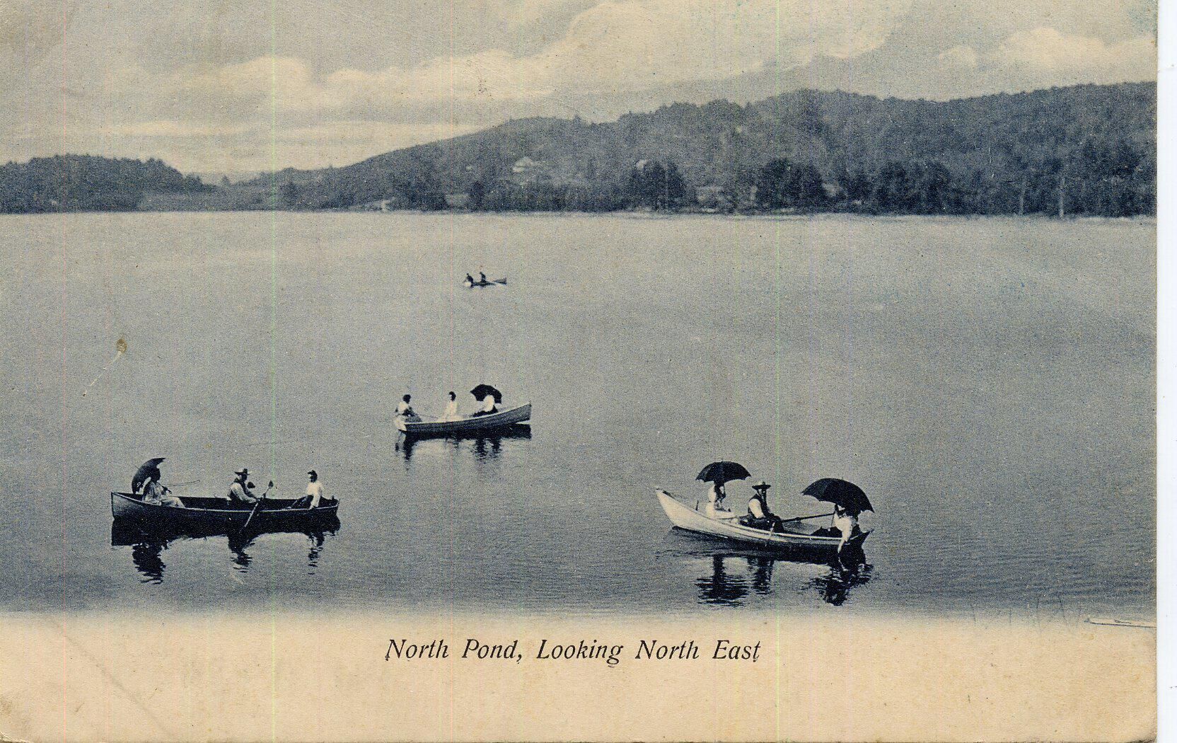 Color postcard of "North Pond," looking North East (now Lake Skatutakee). Mailed 1912. Shows three canoes with passengers, some with parasols. 5.5" x 3.5"