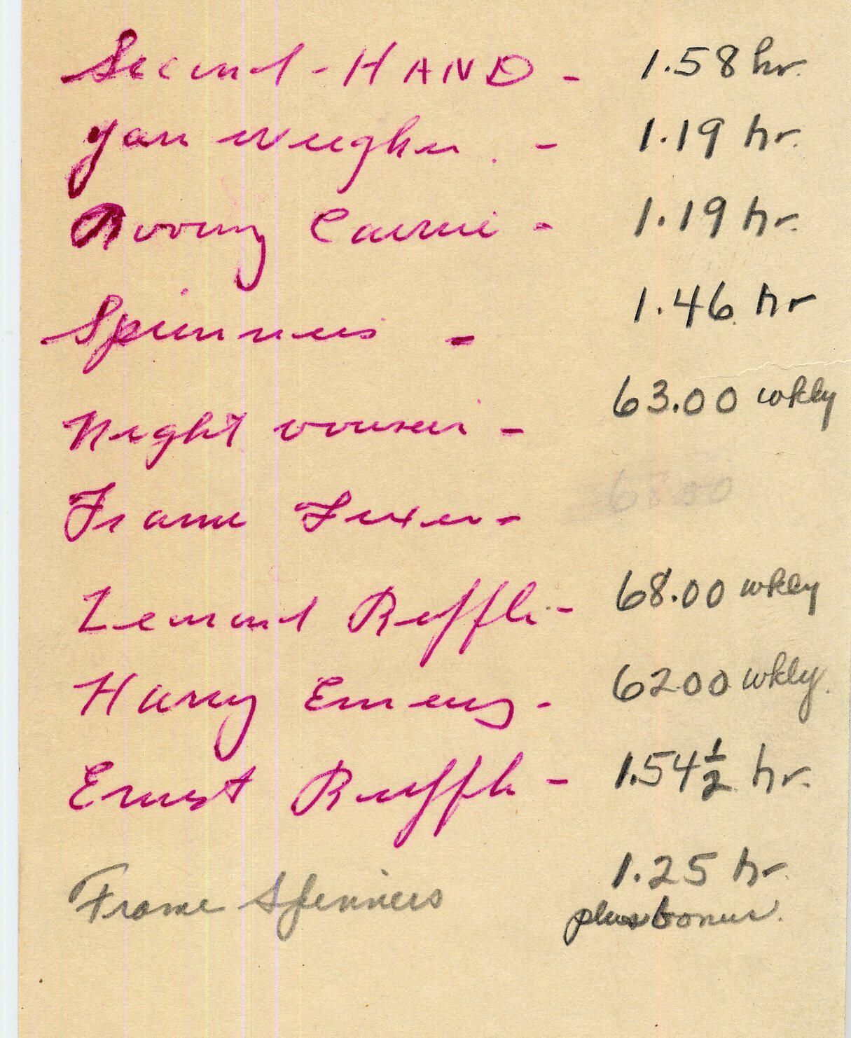 Handwritten list of hourly or weekly rates of pay for individuals and categories of mill workers.
