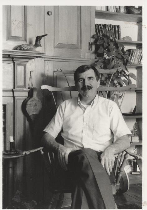 B&W glossy photograph of Rodger Martin, Harrisille resident, poet and teacher at KSC, taken for an article in Common Threads Aig/Sept 2001. Donated to archives by J. Eastman.