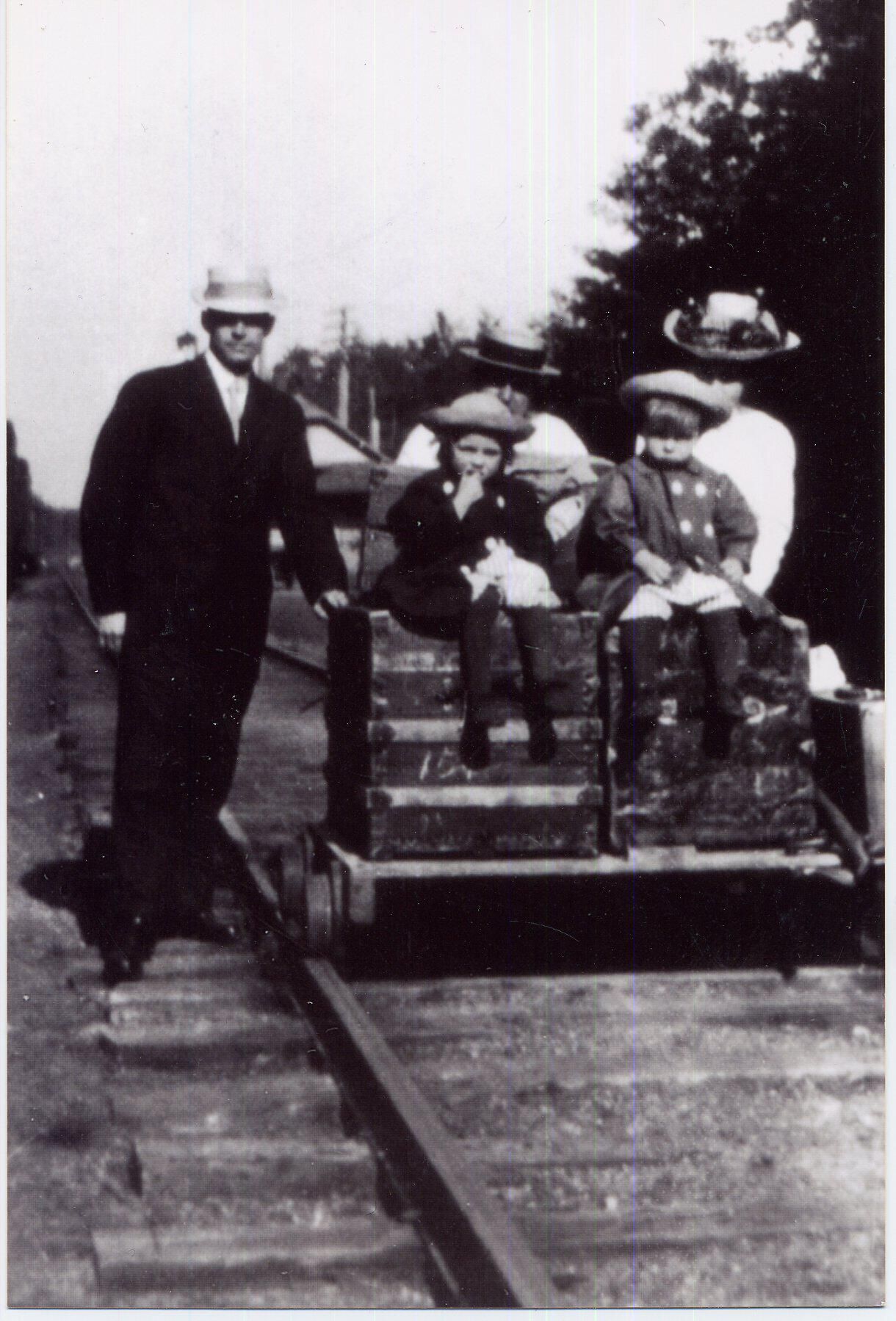 B&W photograph of the Sherwood Family riding down the B&M railroad tracks in an open car from church to their Camp Wellwood, which now is #135 Skatutakee Rd. According to Judy Patton, niece of Margie (who was daughhter of Margaret), the family traveled that way each Sunday. She estimates the photo was taken in the fall of 1911.