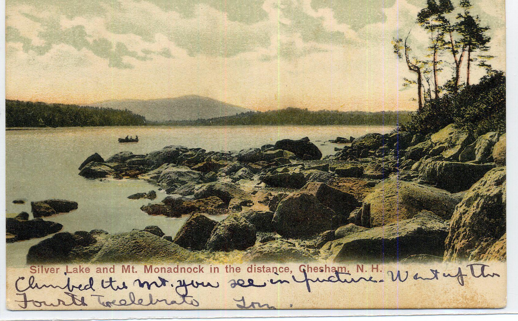 2 copies tinted photo of Silver Lake & Monadnock in distance, Chesham, NH. Notes below photo. Postmarked 7.6/1907; and 8/27/1906(?)