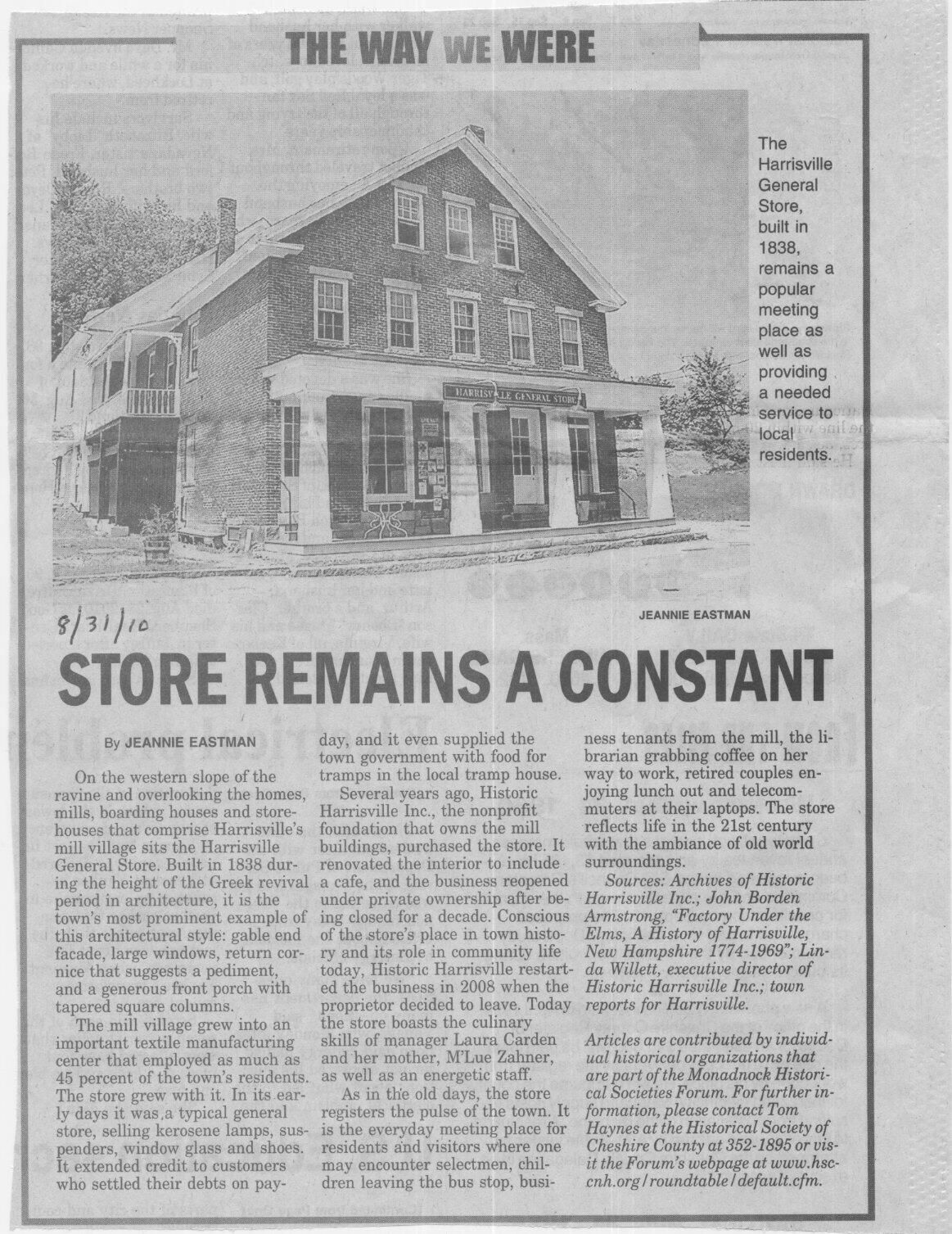 Second in series published in the Keene Sentinel. Photo and text referring to the Harrisville General Store. Copy in Property File HVD 036 7" x 10"" Photo and text