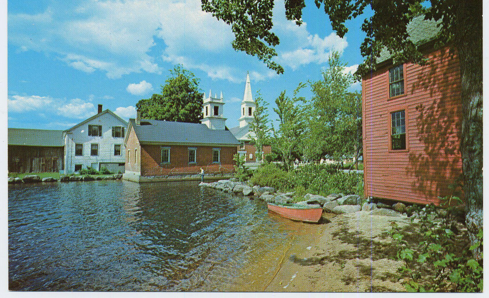 Color Post Card: View of Harrisville pond looking north; taken from beside shed on right, library (vestry), Raley's house with brick church steeple in background; matching row boat in foreground.