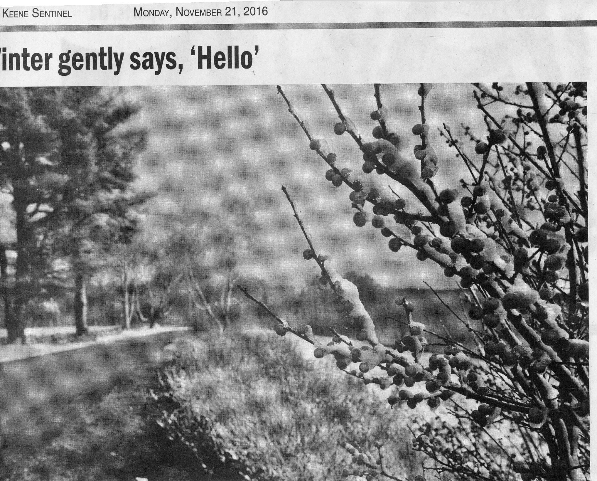 B&W news photo of a road side scene in Harrisville showing the first snow of 2016.