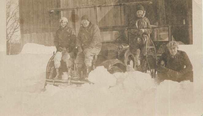 Winter photo of 87 East Lake Road at Silver Lake. The building in the background burned in 1931. Philip H. Faulkner is second from left. There are three other people, two women and a man. There are an automobile and two pairs of snow shoes visible and plenty of snow.