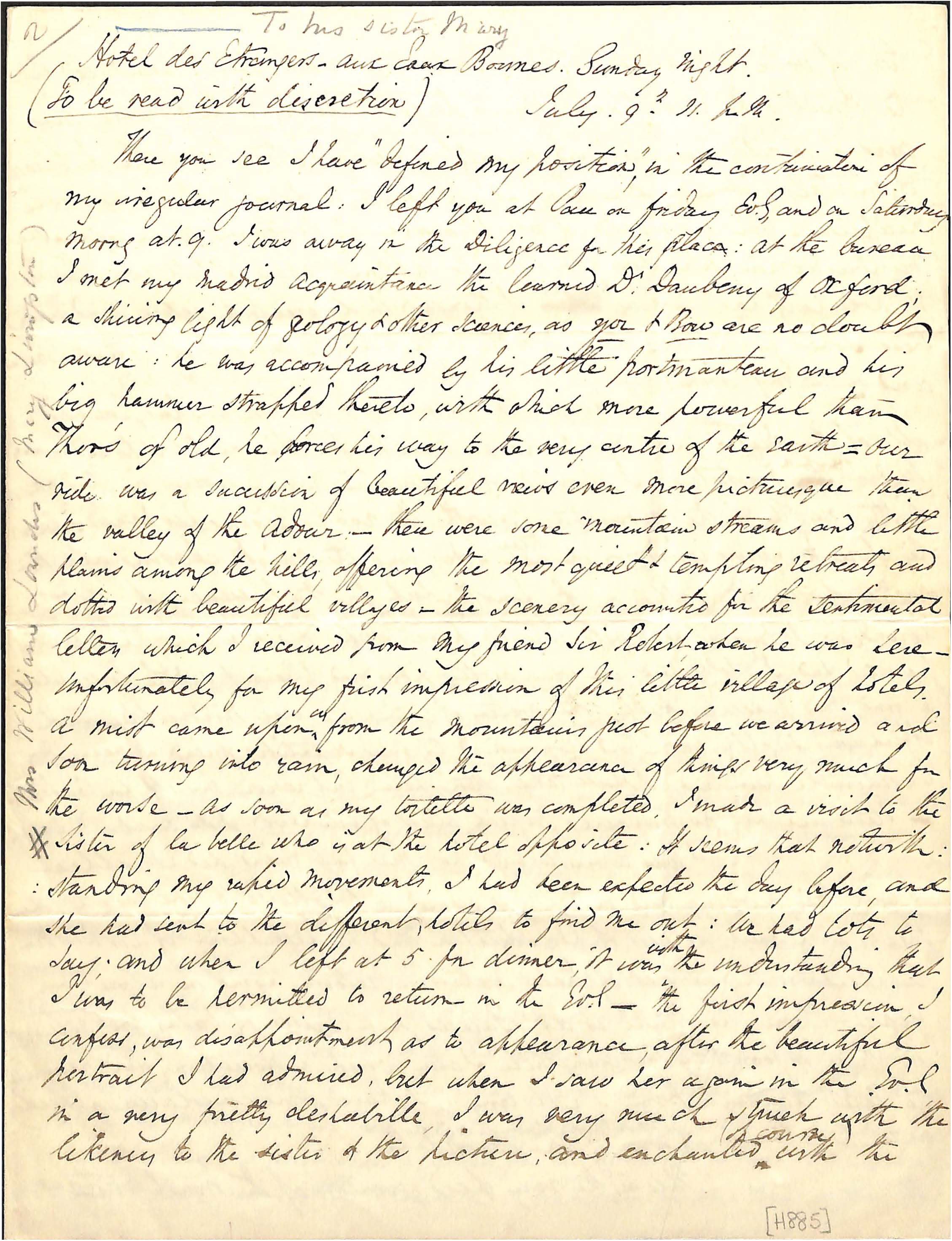 There you see I have “defined my position”, in the continuation of / my irregular journal : I left you at Pau on friday ev’g on Saturday / morn’g at 9 I was away in the Diligence for this place : at the bureau / I met my Madrid acquaintance the learned Dr. Danberry of Oxford; / a shining light of geology + other sciences, as you + Bow are no doubt / aware : he was accompanied by his little portmanteau and his / big hammer strapped thereto, with which more powerful than / Thor’s of old, he forces his way to the very centre of the Earth = our / ride was a succession of beautiful views even more picturesque than / the valley of the Adour _ there were some mountain streams and little / plains among the hills, offering the most quiet + tempting retreats, and / dotted with beautiful villages _ the scenery accounts for the sentimental / letters which I received from my friend Sir Robert when he was here _ / Unfortunately for my first impression of this little village of hotels / a mist came upon us form the mountains just before we arrived and / soon turning into rain, changed the appearance of things very much for / the worse _ as soon as my toilette was completed, I made a visit to the / sister of la belle who is at the hotel opposite : It seems that notwith: / standing my rapid movements, I had been expected the day before, and / she had sent to the different hotels to find meout : We had lots to / say : and when I left at 5 for dinner it was [^ with] the understanding that / I was to be permitted to return in the Ev’g _ the first impression I / confess was disappointment as to appearance, after the beautiful / portrait I had admired, but when I was her again in the Ev’g / in a very pretty dishabille, I was very much struck with the / likeness to the sister of the picture, and enchanted [^ (of course)] with the /