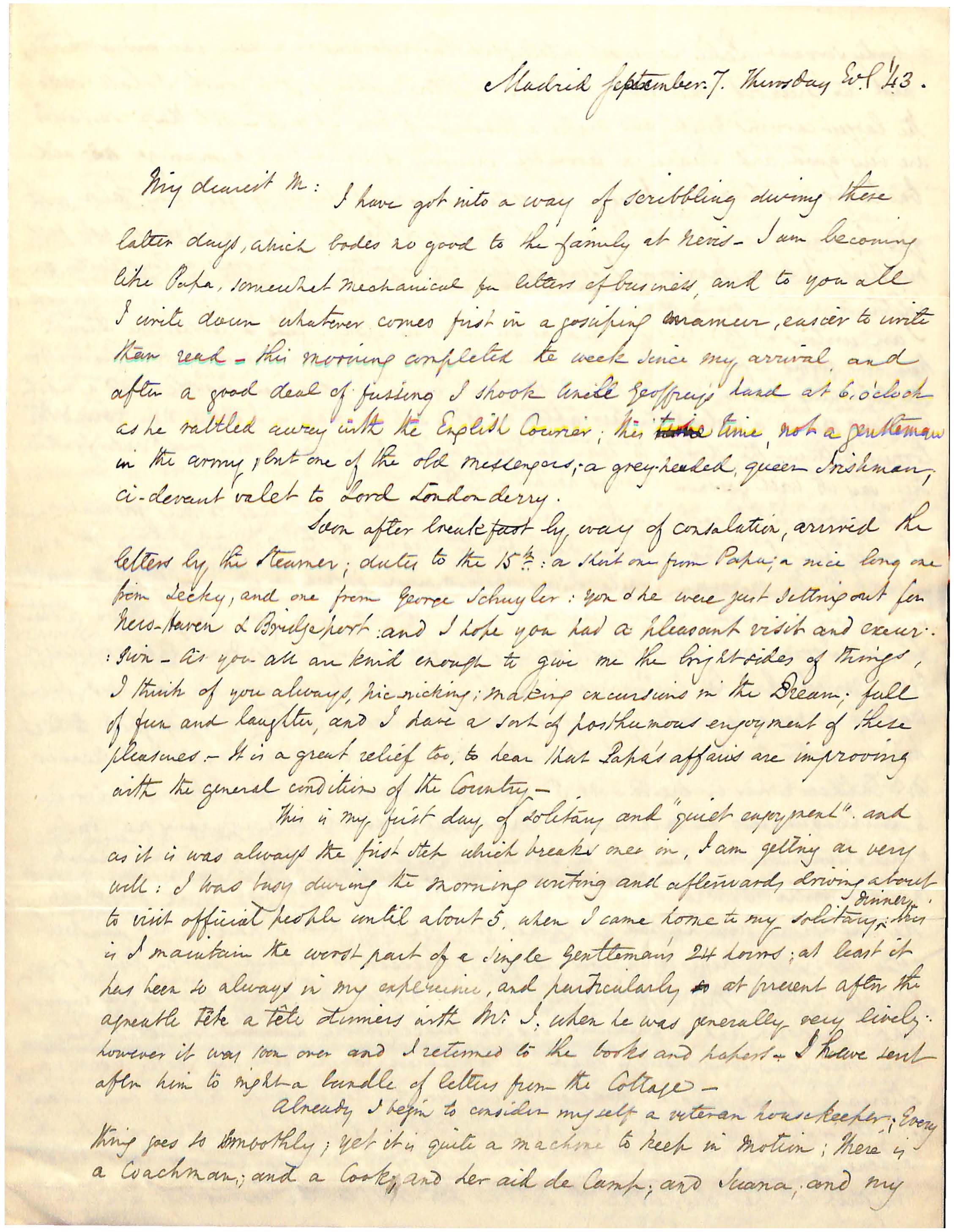 Soon after breakfast by way of consolation, arrived the / letters by the steamer; dates to the 15th a short one from Papa; a nice long one / from [L-?]ecky, and one from George Schuyler : you + he were just setting out for / New-Haven + Bridgeport : and I hope you had a pleasant visit and excur - / sion _ As you all are kind enough to give me the brightsides of things, / I think of you always, pic-nicking; making excursions in the Dream; full / of fun and laughter, and I have a sort of posthumous enjoyment of these / pleasures _ It is a great relief too to hear that Papa’s affairs are improving / with the general condition of the Country _